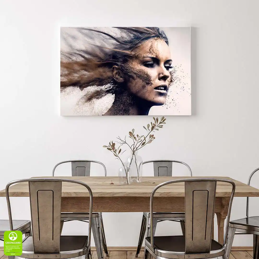 - techniką druku - proces drukowania wykorzystuje inne metody tworzenia kolorów (tzw. "przestrzeń barw") niż te, które stosowane są na ekranach komputera; kolory drukowane mogą wyglądać również nieco inaczej na różnych materiałach (np. canvasie, flizelinie, papierze czy szkle itp.) i przy użyciu różnych tuszy, w naszym przypadku tuszy do druku UV; złote elementy nie są wybiórczo metalizowane - efekt uzyskany jest poprzez wydruk tekstury w kolorze złota;