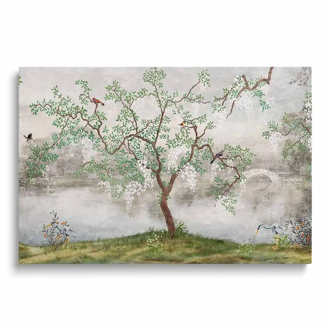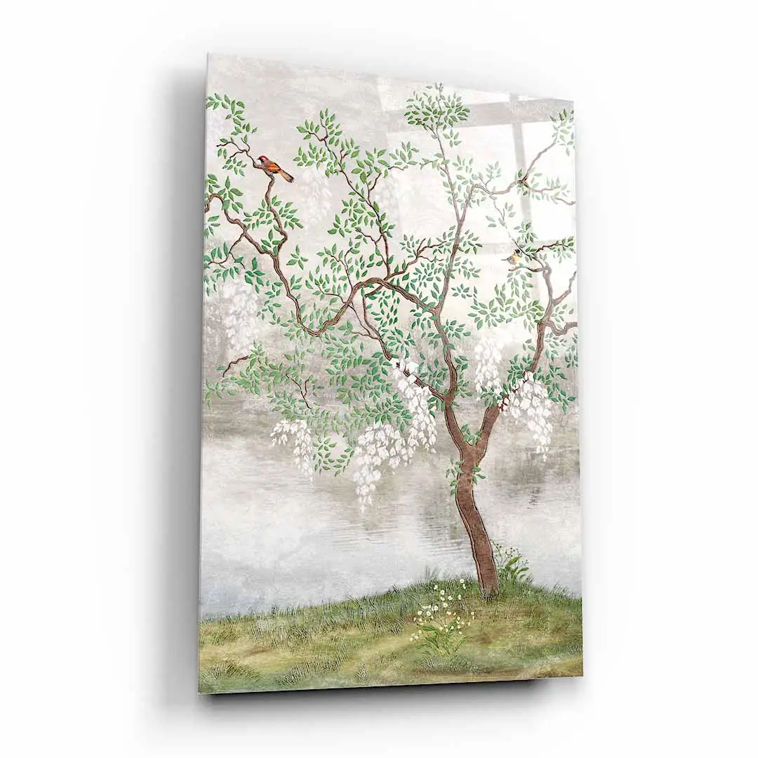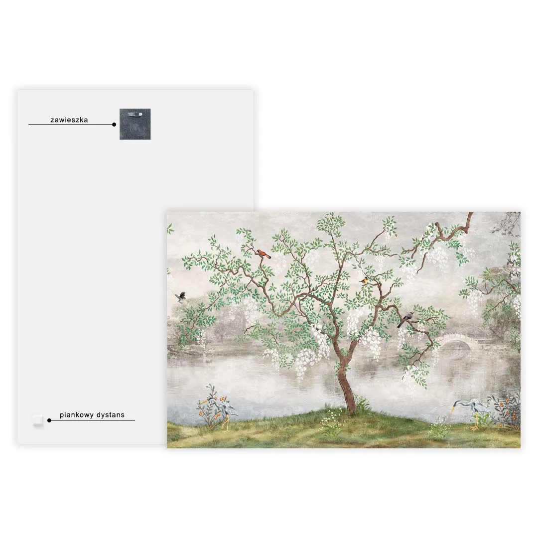 Obraz na szkle akrylowym - Orientalny pejzaż z drzewem i ptakami