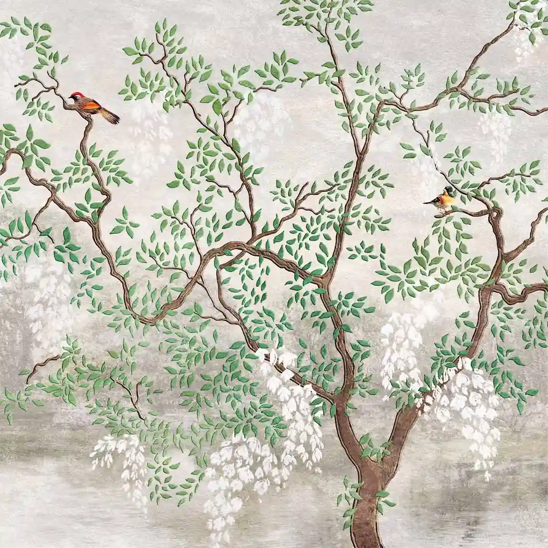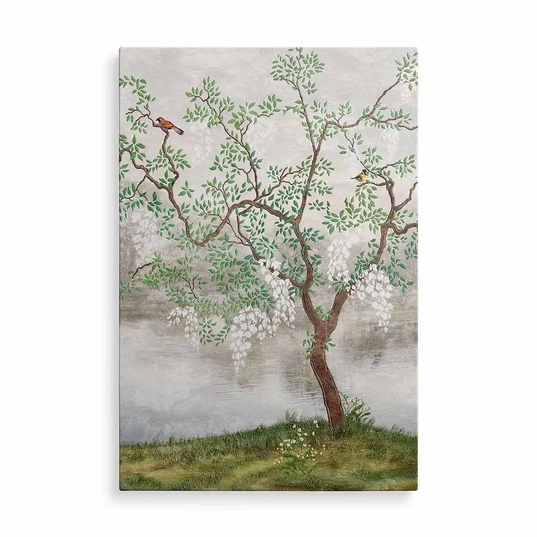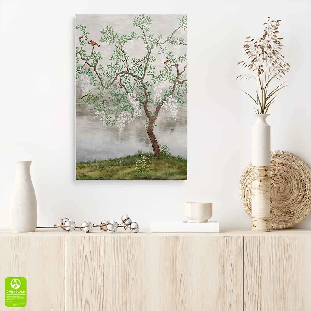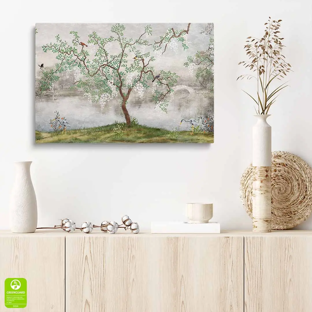 Obraz na szkle akrylowym - Orientalny pejzaż z drzewem i ptakami