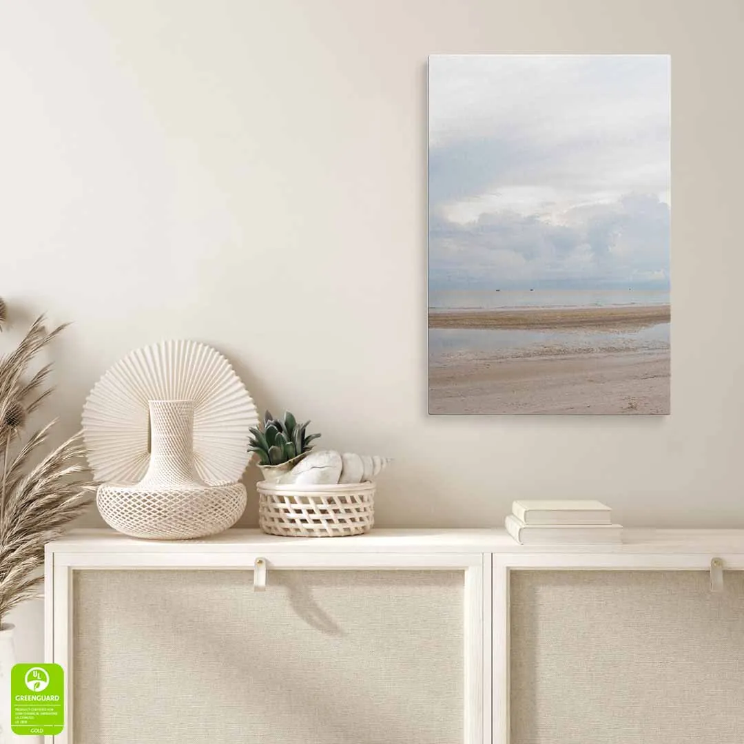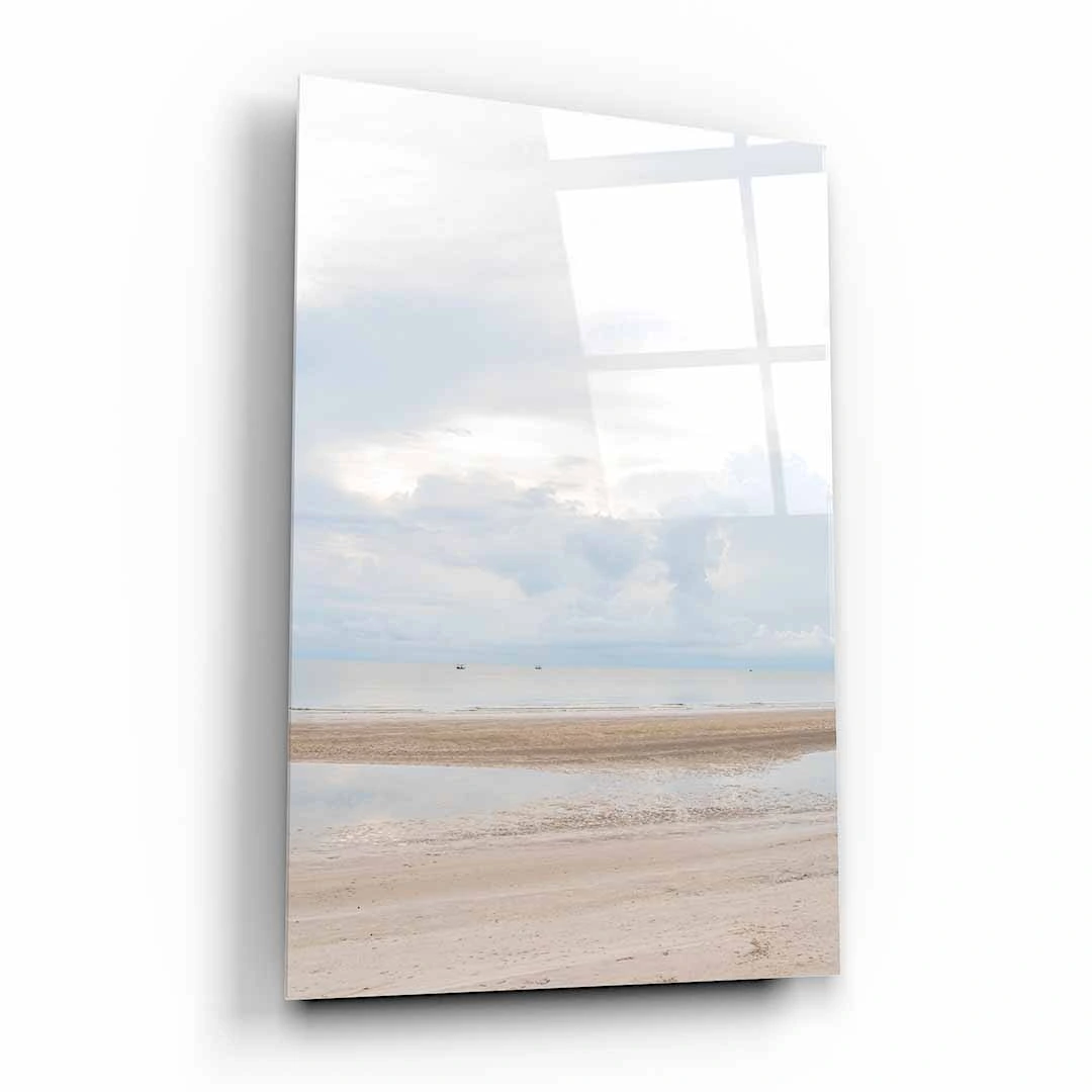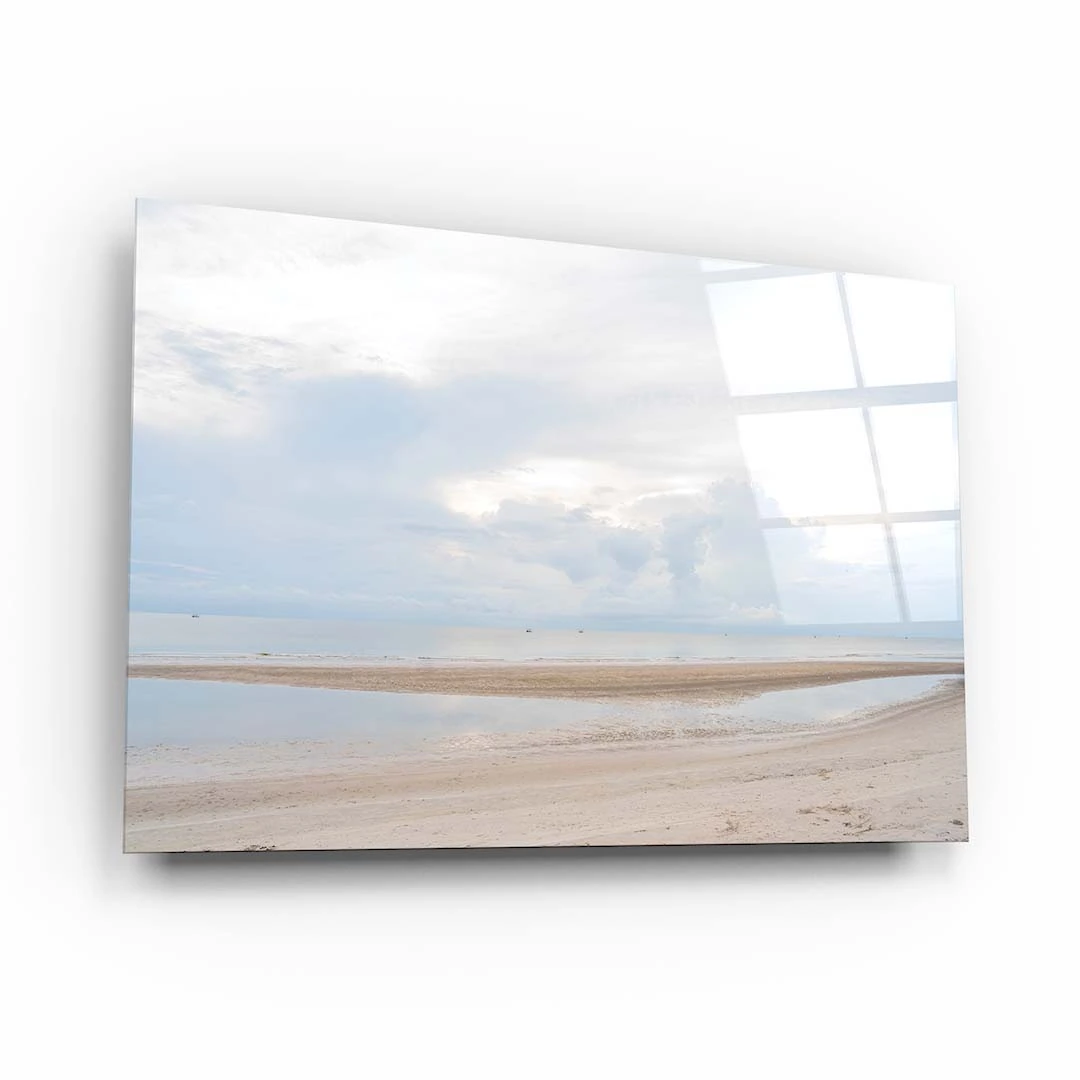 Obraz na szkle akrylowym - Pejzaż Plaży z Morzem, Piaskiem i Chmurami, Minimalistyczny Krajobraz do Salonu lub Sypialni
