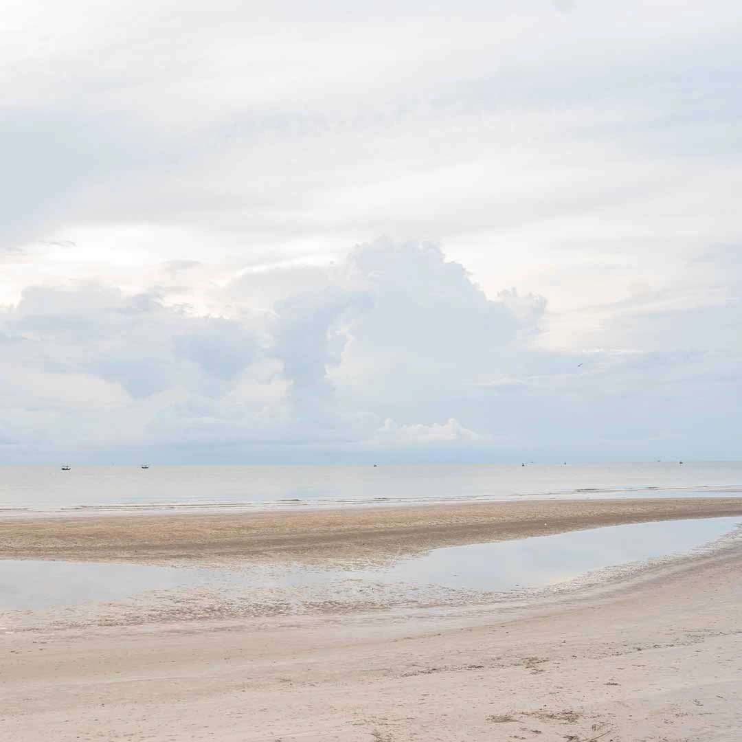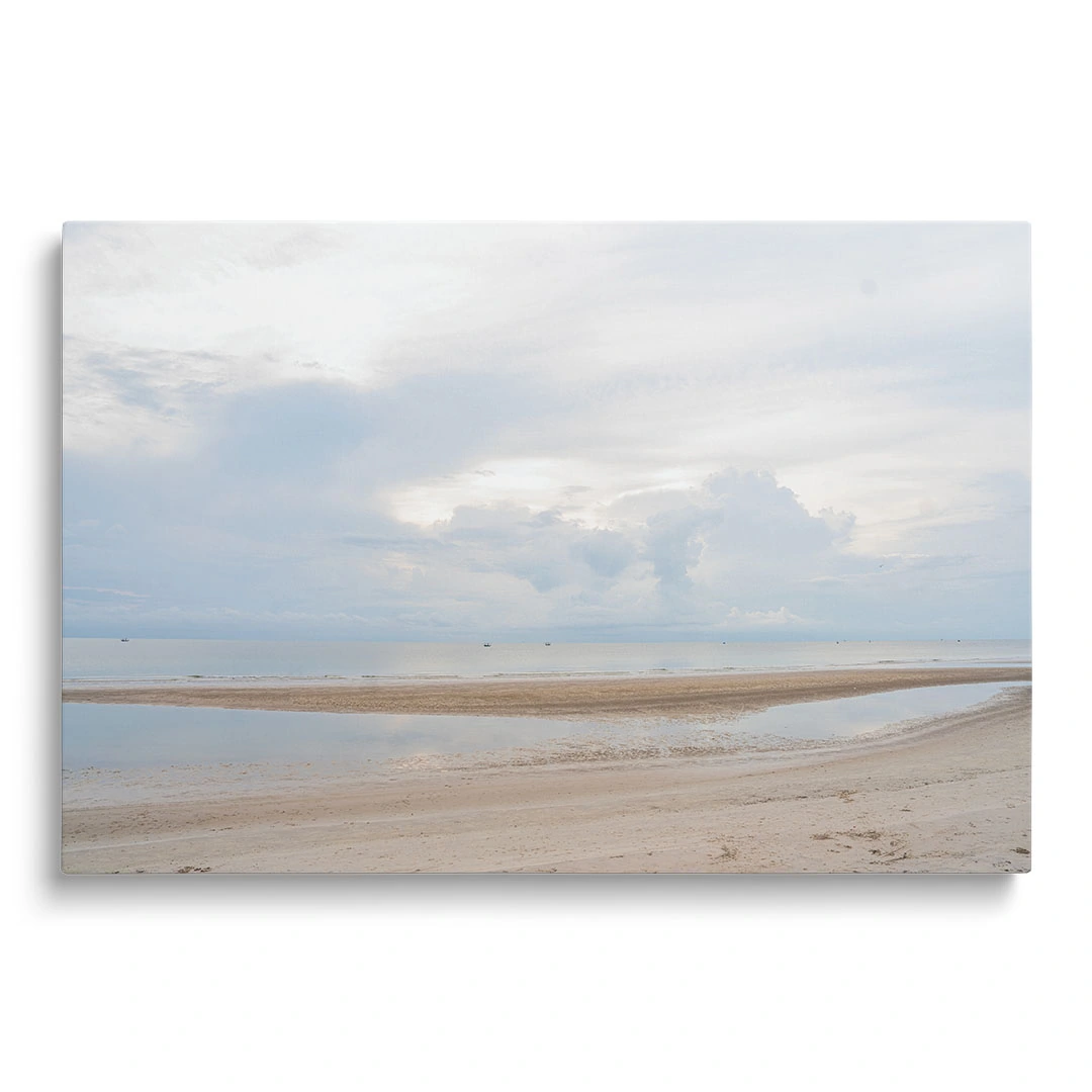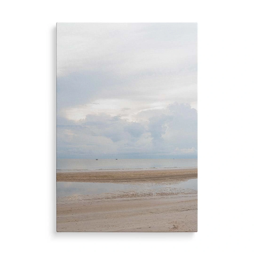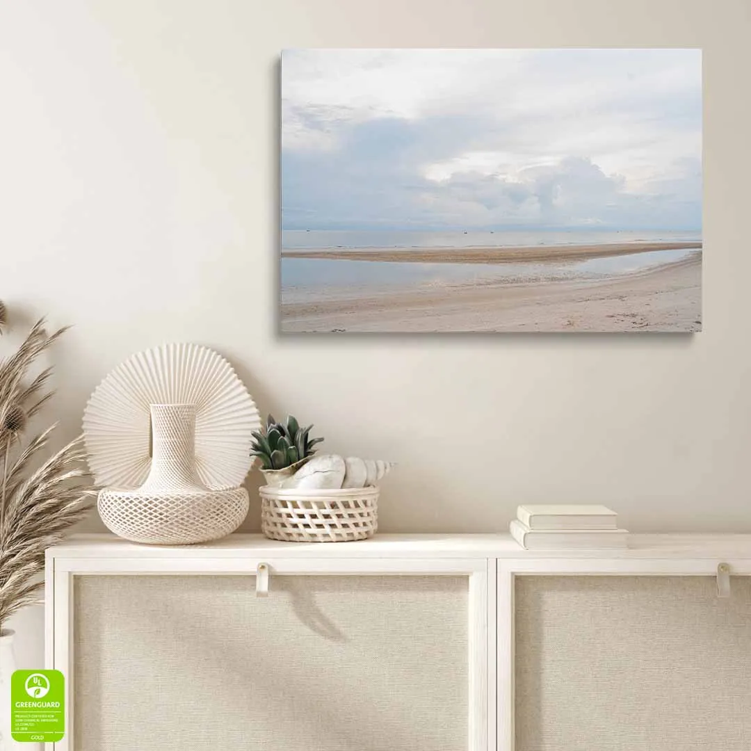 Obraz na szkle akrylowym - Pejzaż Plaży z Morzem, Piaskiem i Chmurami, Minimalistyczny Krajobraz do Salonu lub Sypialni