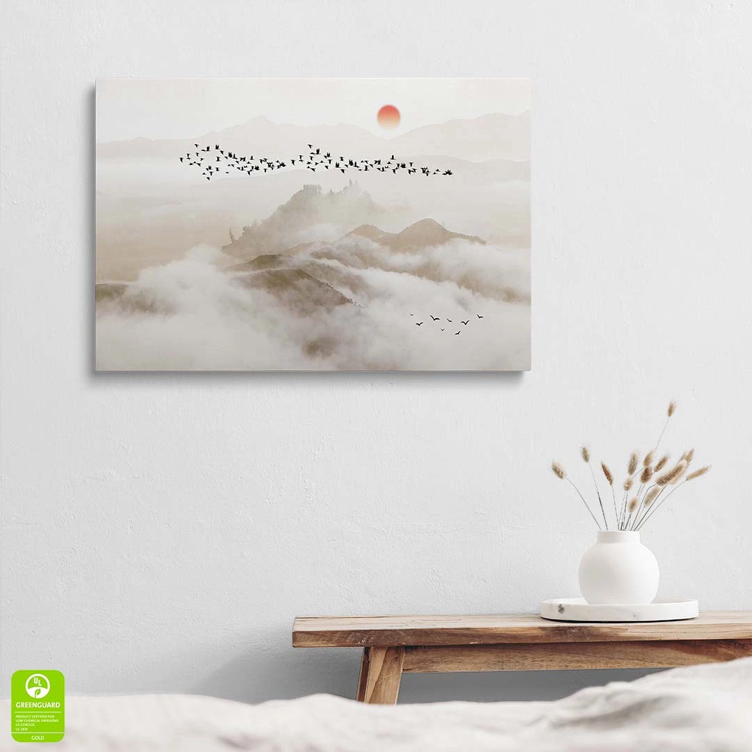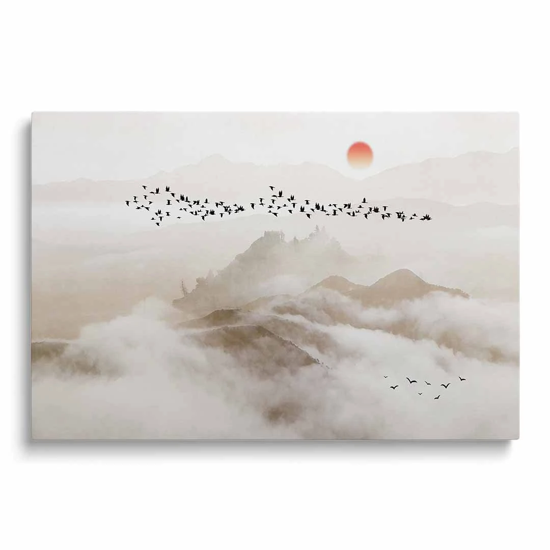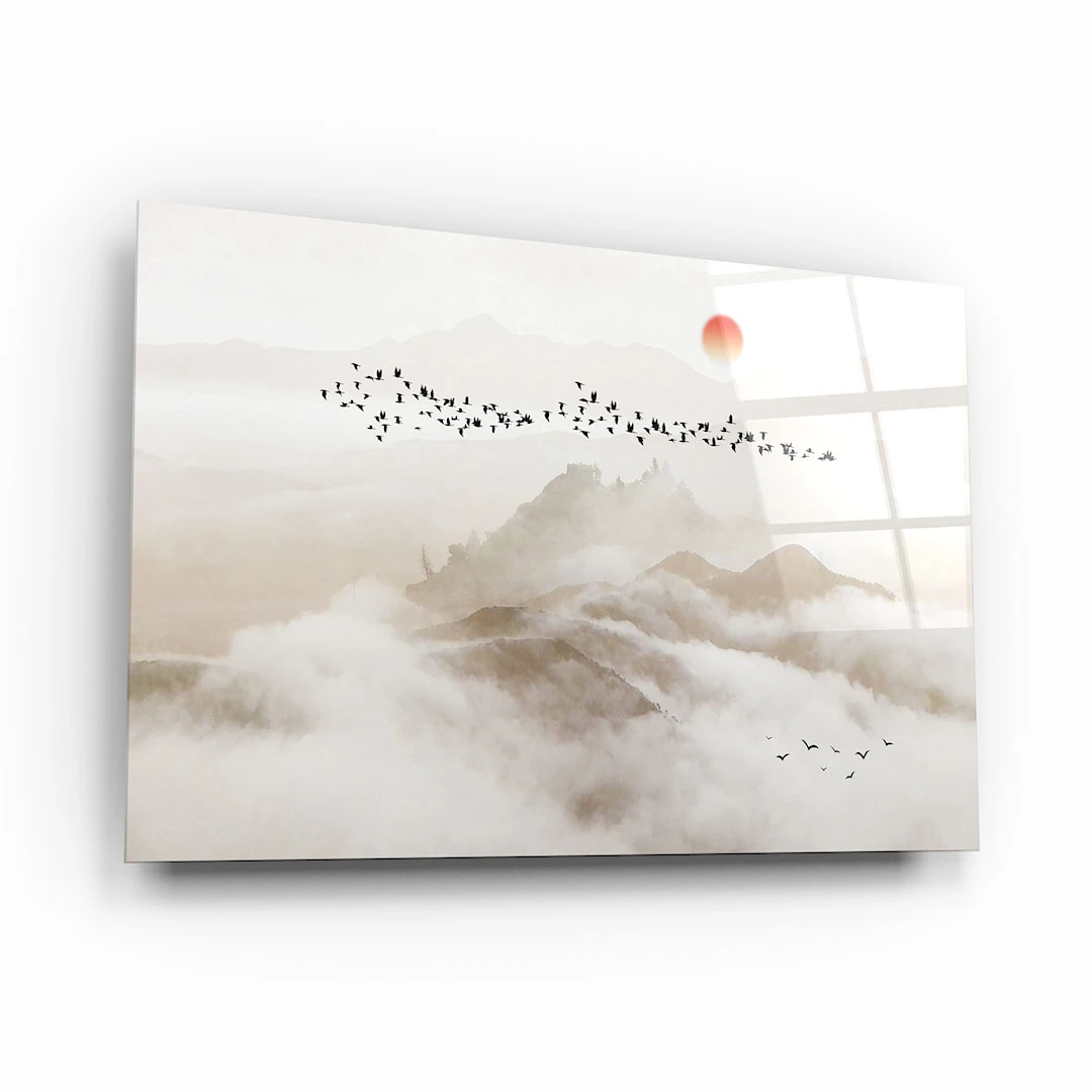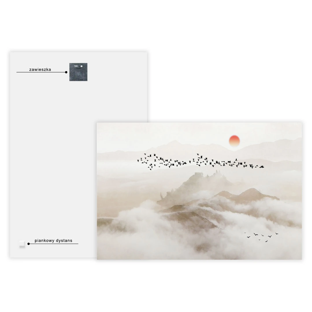 Obraz na szkle akrylowym - Pejzaż górski w odcieniach beżu z mgłą i ptakami