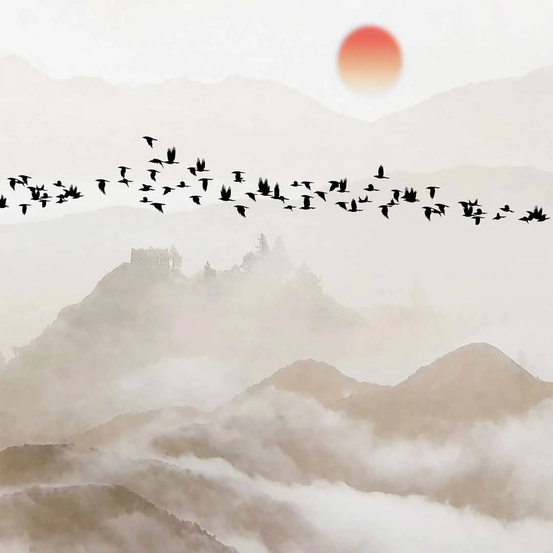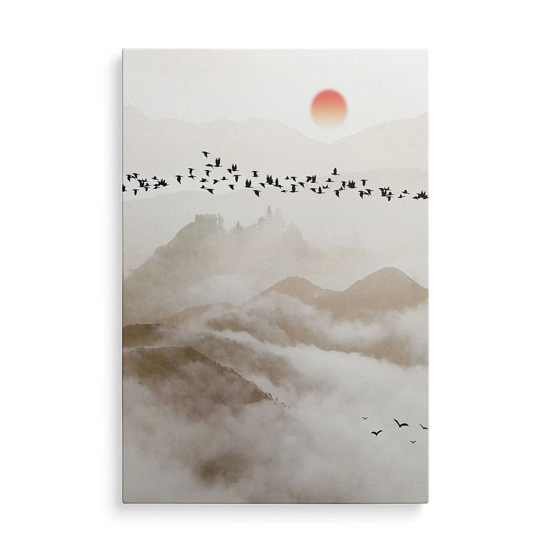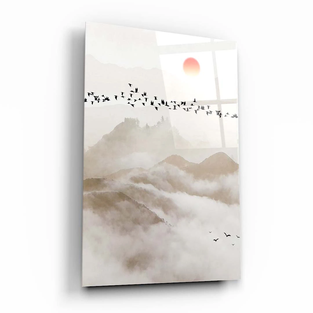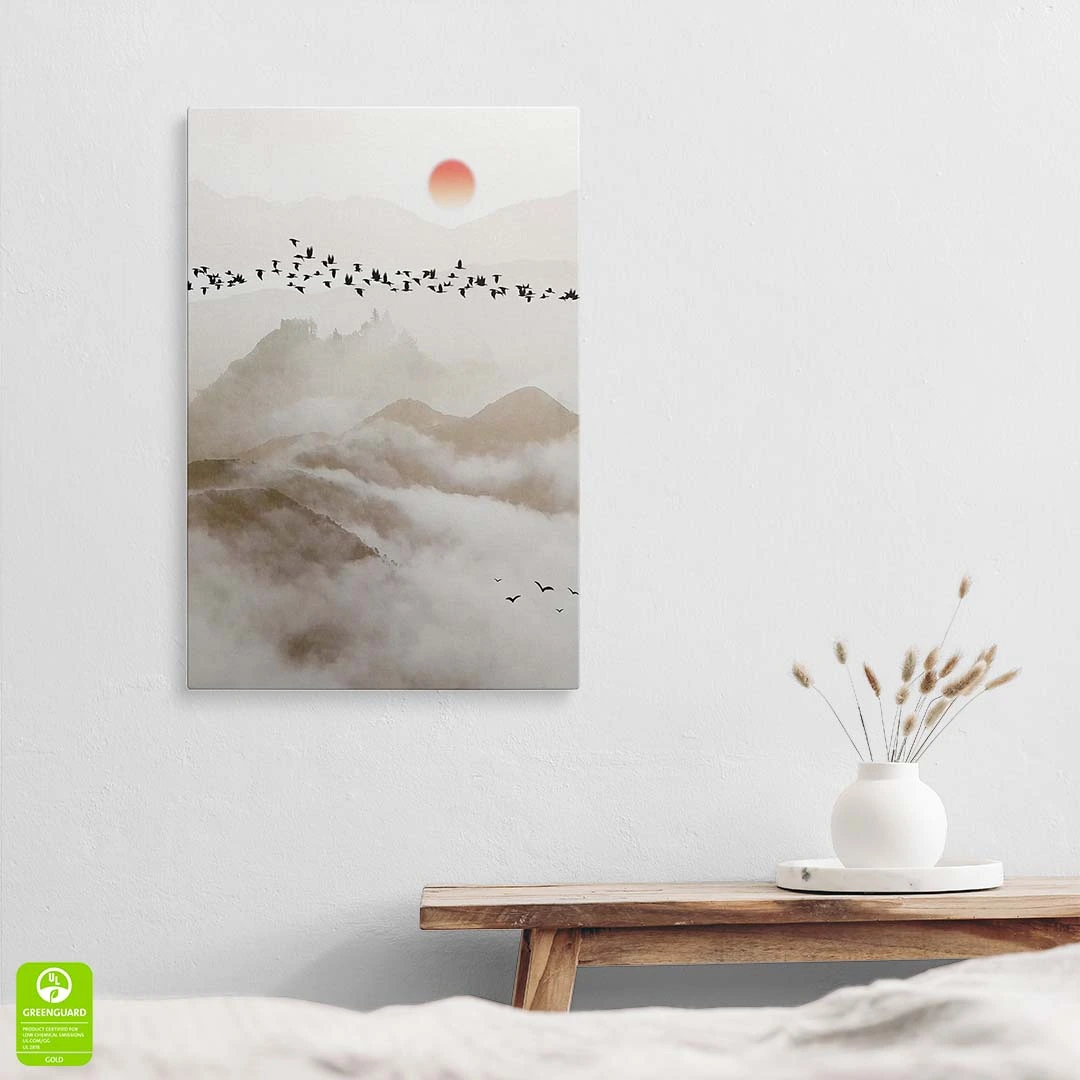 Obraz na szkle akrylowym - Pejzaż górski w odcieniach beżu z mgłą i ptakami
