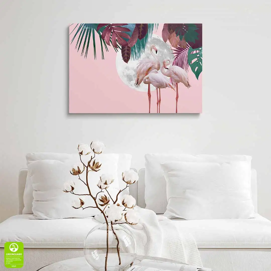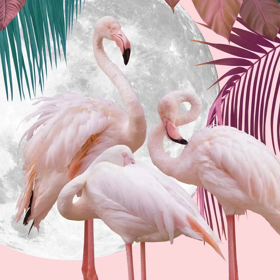 Obraz na szkle akrylowym - Piękne flamingi na tle księżyca i tropikalnej roślinności