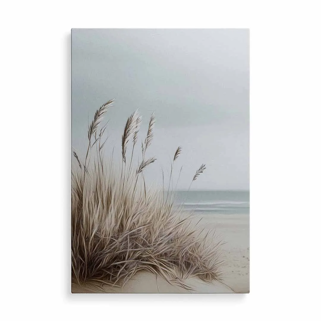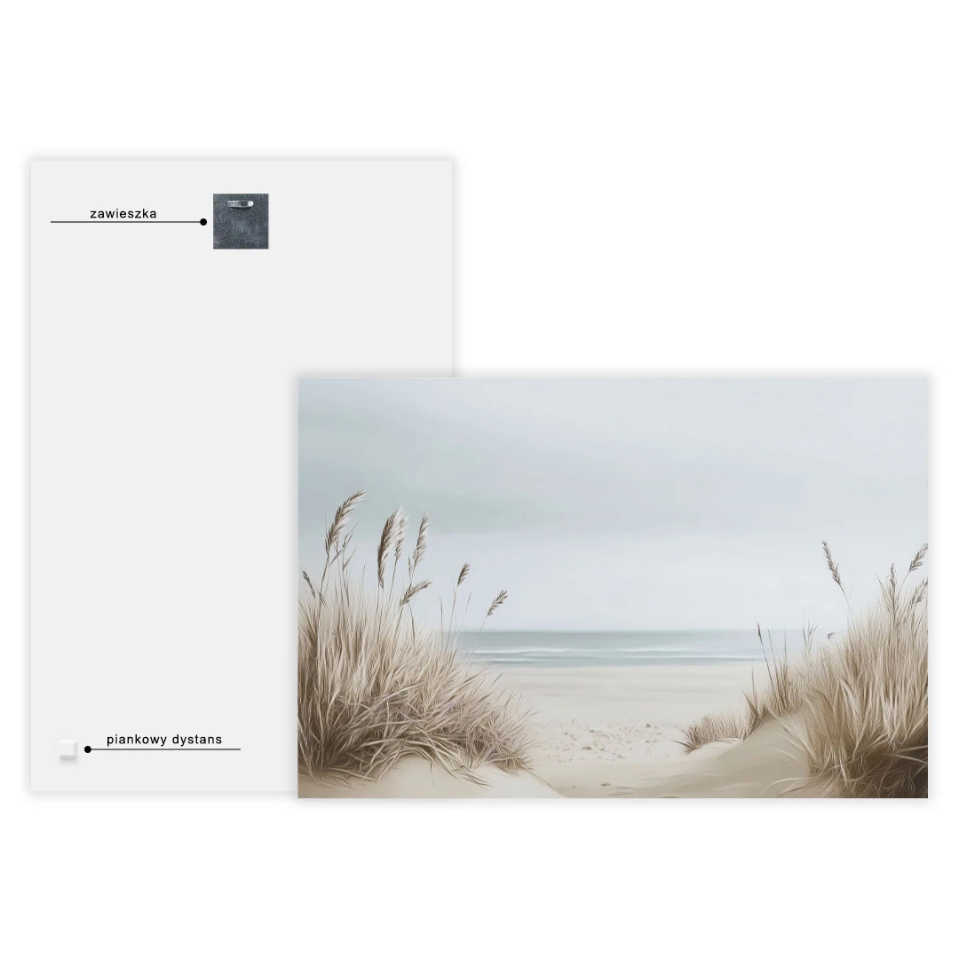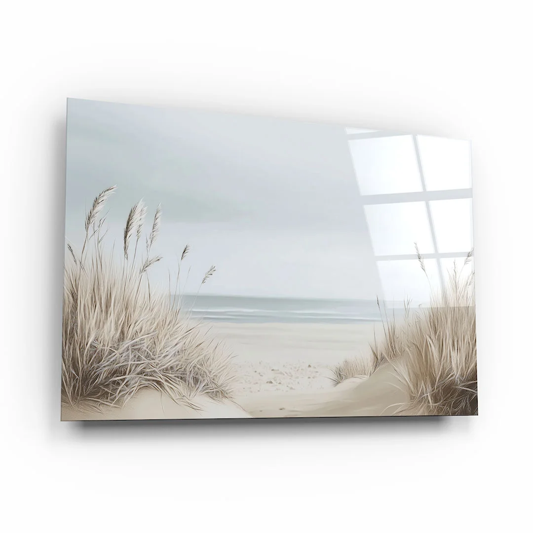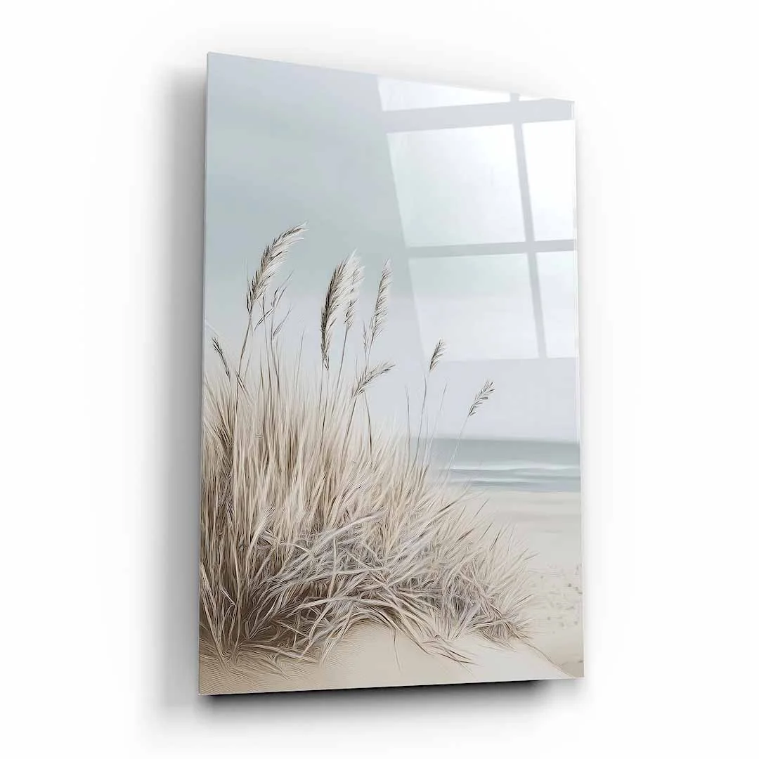 Obraz na szkle akrylowym - Plaża z trawami – Spokojny pejzaż morski do salonu, sypialni i biura