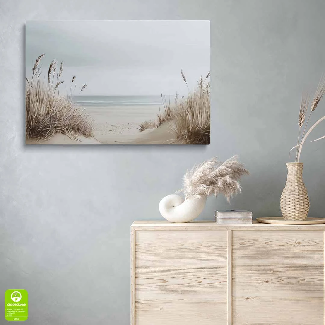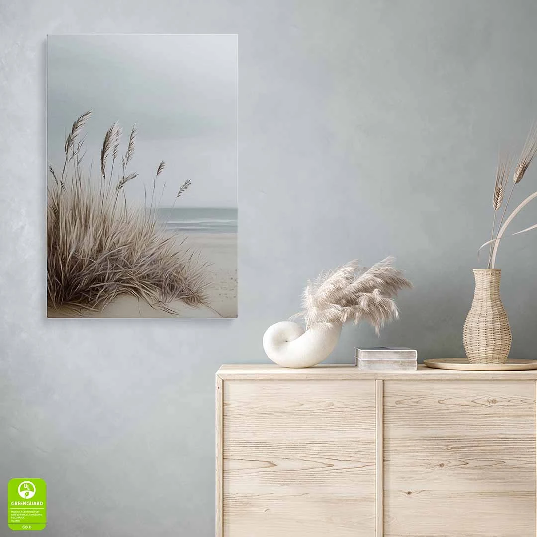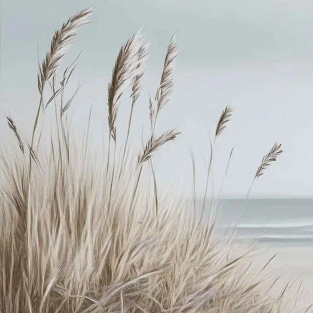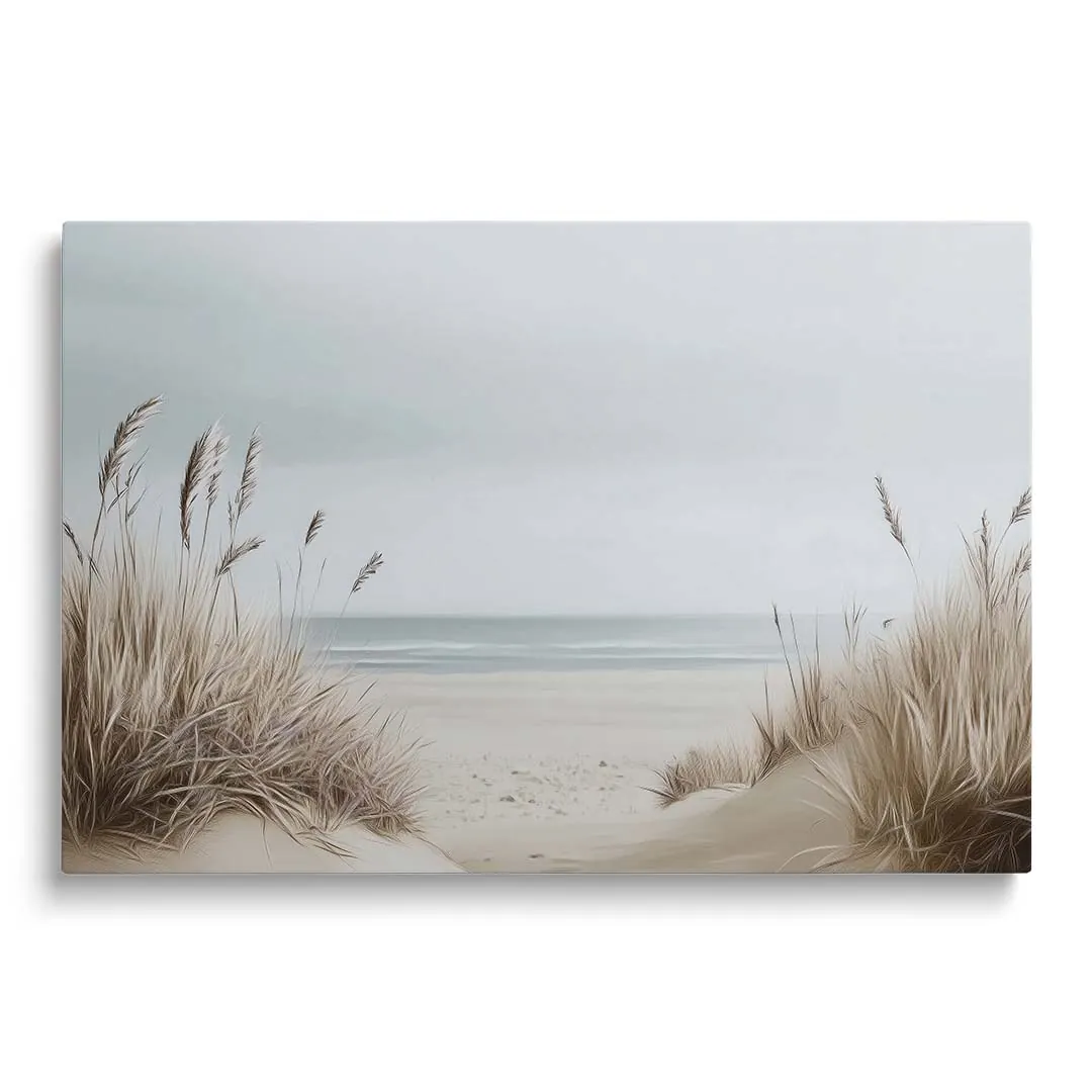 Obraz na szkle akrylowym - Plaża z trawami – Spokojny pejzaż morski do salonu, sypialni i biura