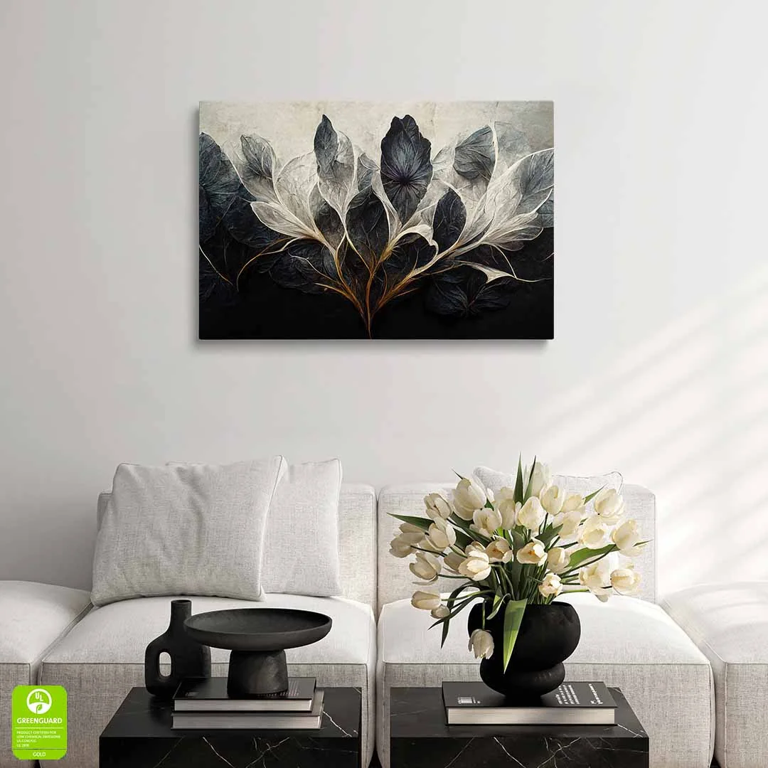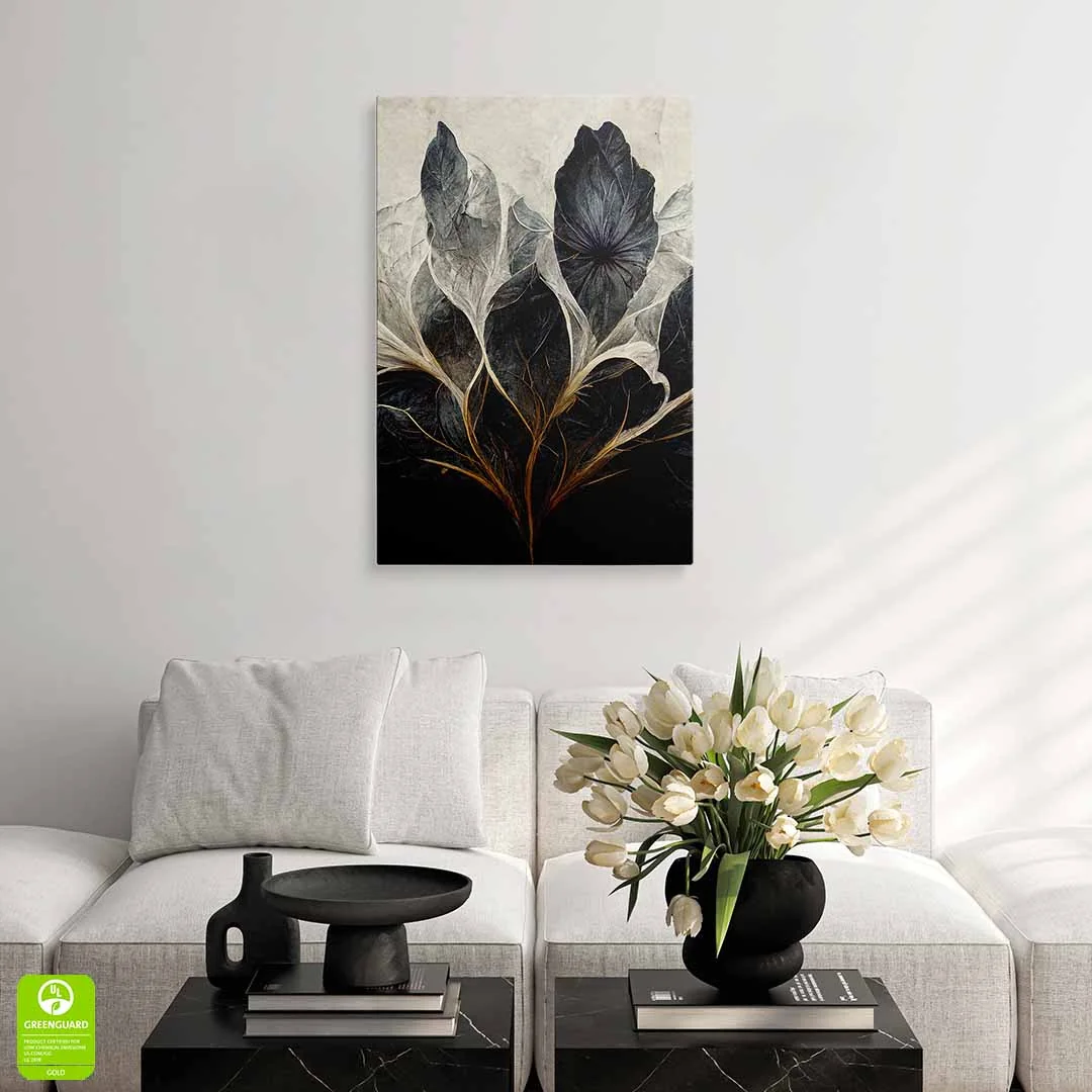 - techniką druku - proces drukowania wykorzystuje inne metody tworzenia kolorów (tzw. "przestrzeń barw") niż te, które stosowane są na ekranach komputera; kolory drukowane mogą wyglądać również nieco inaczej na różnych materiałach (np. canvasie, flizelinie, papierze czy szkle itp.) i przy użyciu różnych tuszy, w naszym przypadku tuszy do druku UV; złote elementy nie są wybiórczo metalizowane - efekt uzyskany jest poprzez wydruk tekstury w kolorze złota;