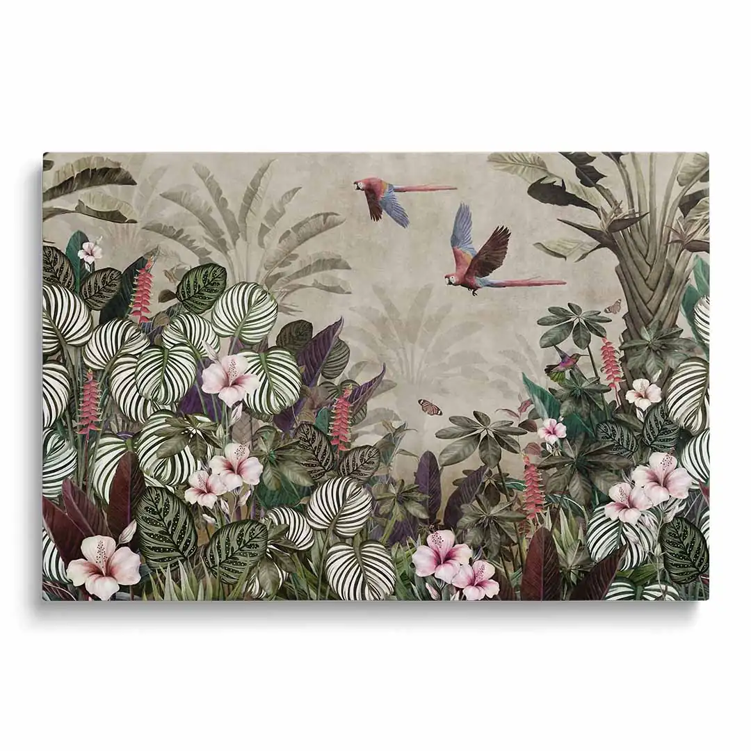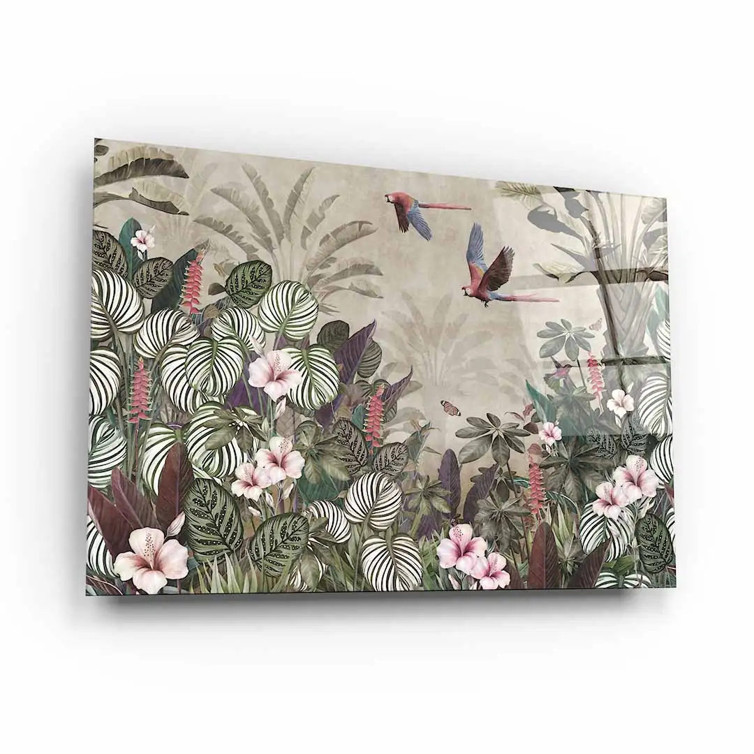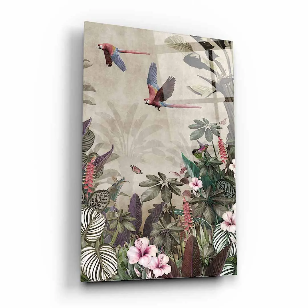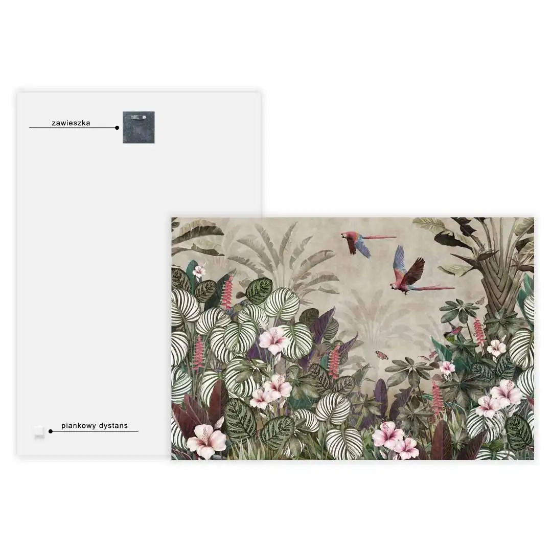Obraz na szkle akrylowym - Tropikalny las – Papugi, koliber i kwiaty hibiskusa