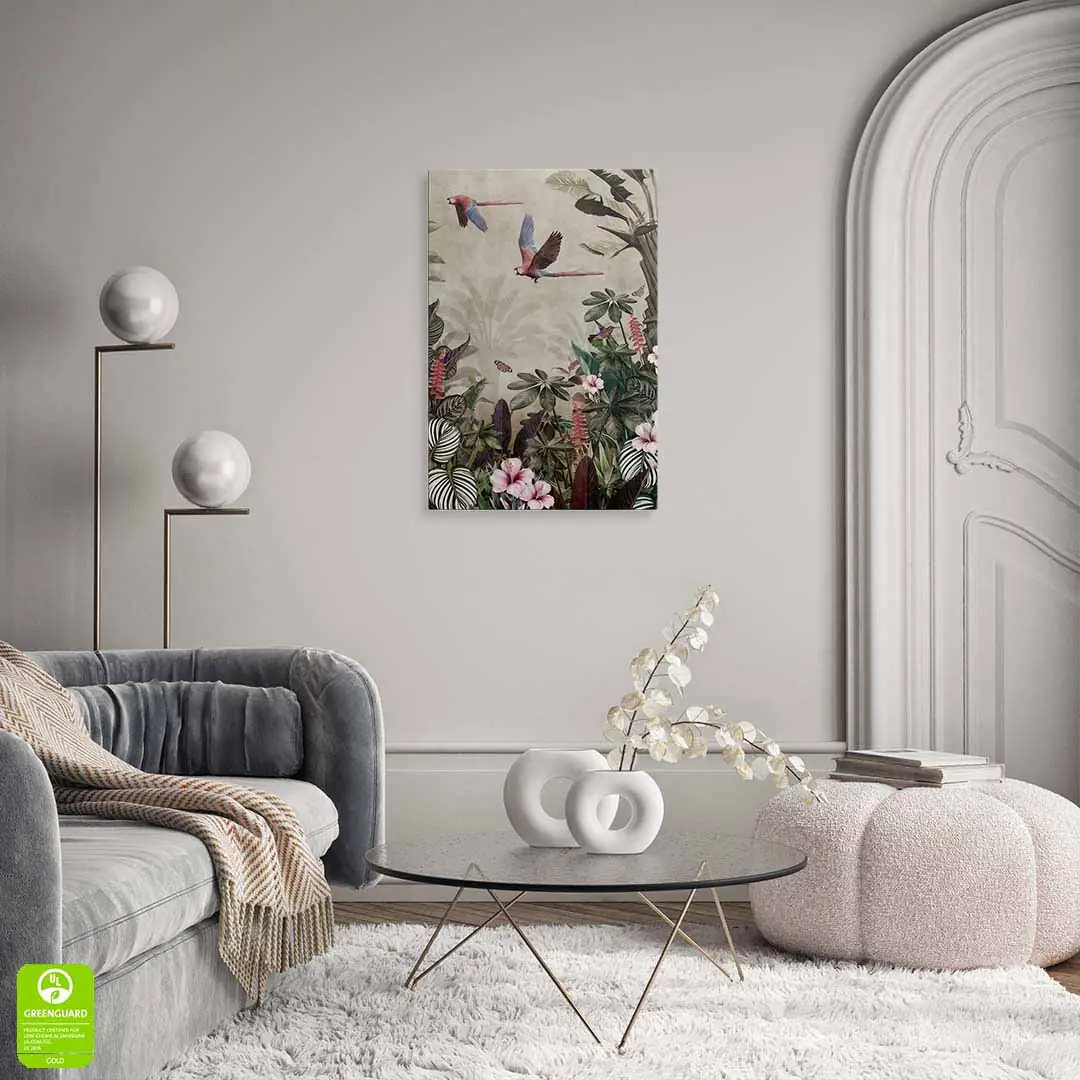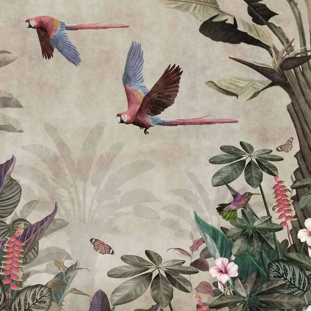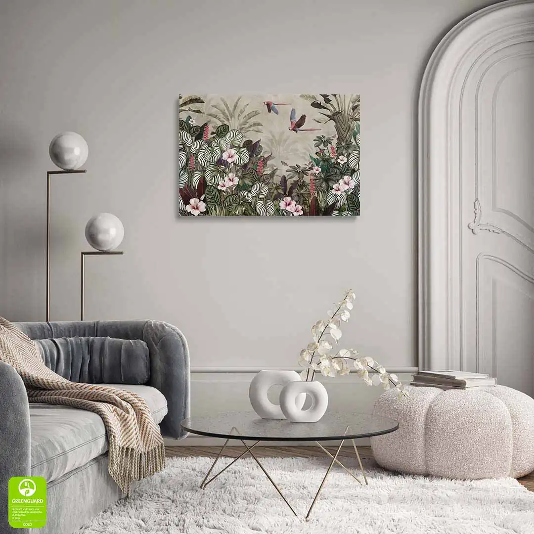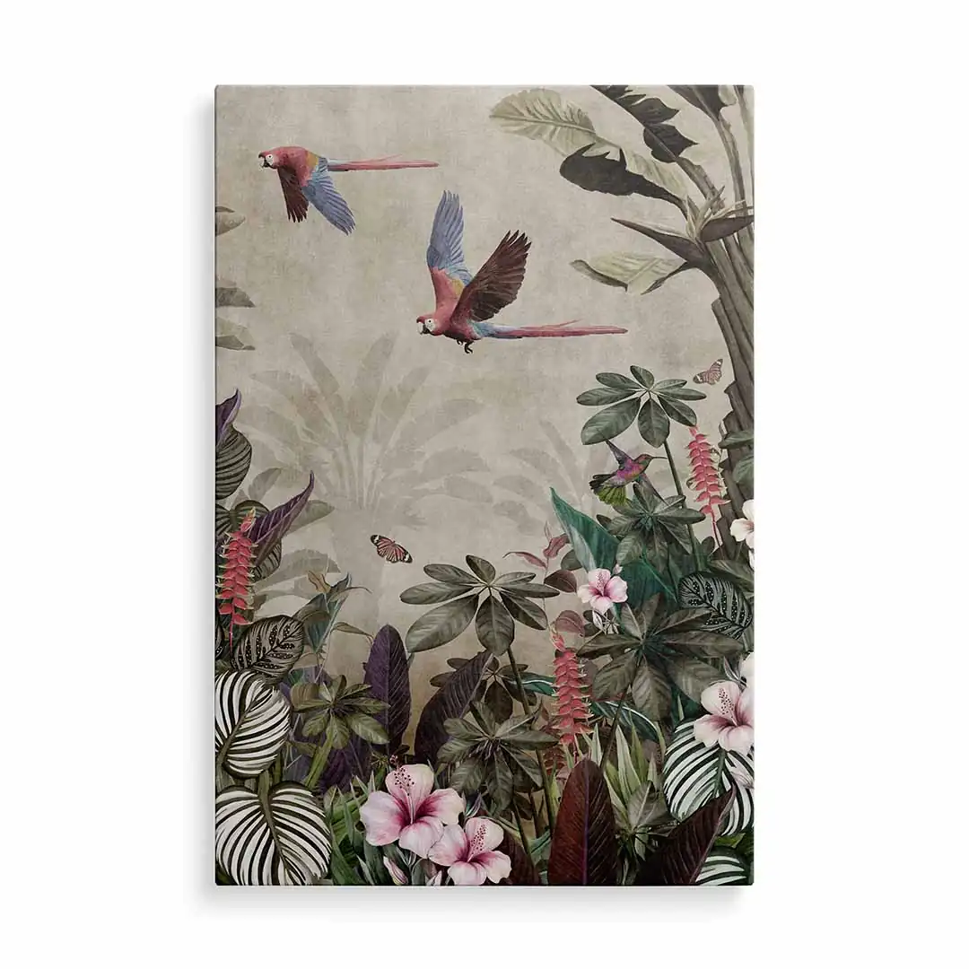 Obraz na szkle akrylowym - Tropikalny las – Papugi, koliber i kwiaty hibiskusa