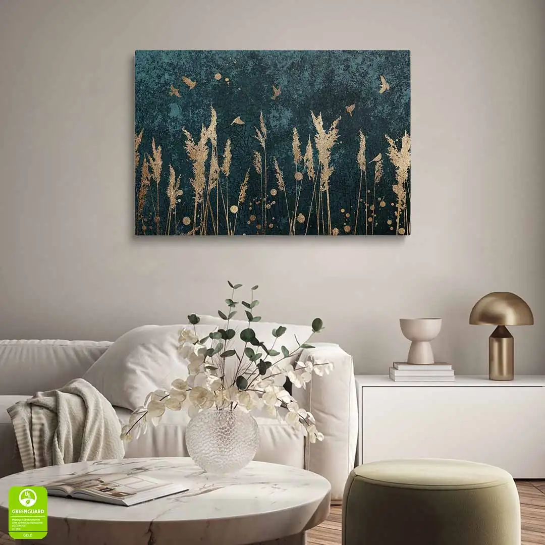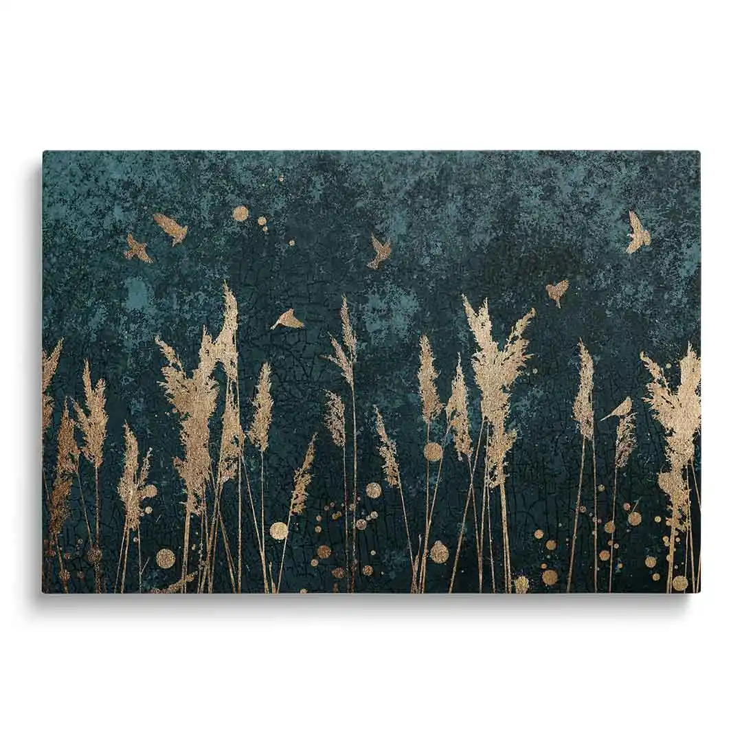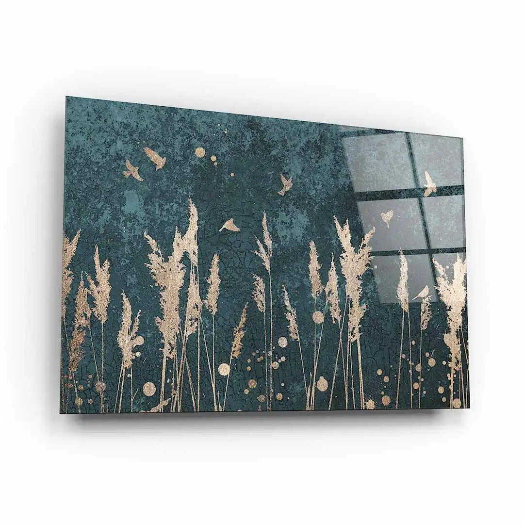 Obraz na szkle akrylowym - Złote trzciny i ptaki to doskonała propozycja dla osób ceniących oryginalne wzornictwo. Obraz ze względu na kolorystykę będzie ciekawym elementem wystroju wnętrza. Tło, ciemne, ma interesującą, mocno przetartą strukturę utrzymaną w tonacji zielononiebieskiej, na którym pięknie się prezentują delikatne ptaki i trawy w kolorze złota. Kolor złoty uzyskujemy przez wydruk, nie jest to złoto metalizowane czy pozłacane. Obraz na szkle akrylowym - Złote trzciny i ptaki będzie pasować do wielu stylów wykończenia wnętrz od skandynawskiego po nowoczesny. Połysk szklanej tafli pięknie podkreśla klimatyczny motyw prezentujący się na tym obrazie. Jeśli marzy Ci się drobny lifting nudnej ściany, to nasz obraz z pewnością w tym pomoże.