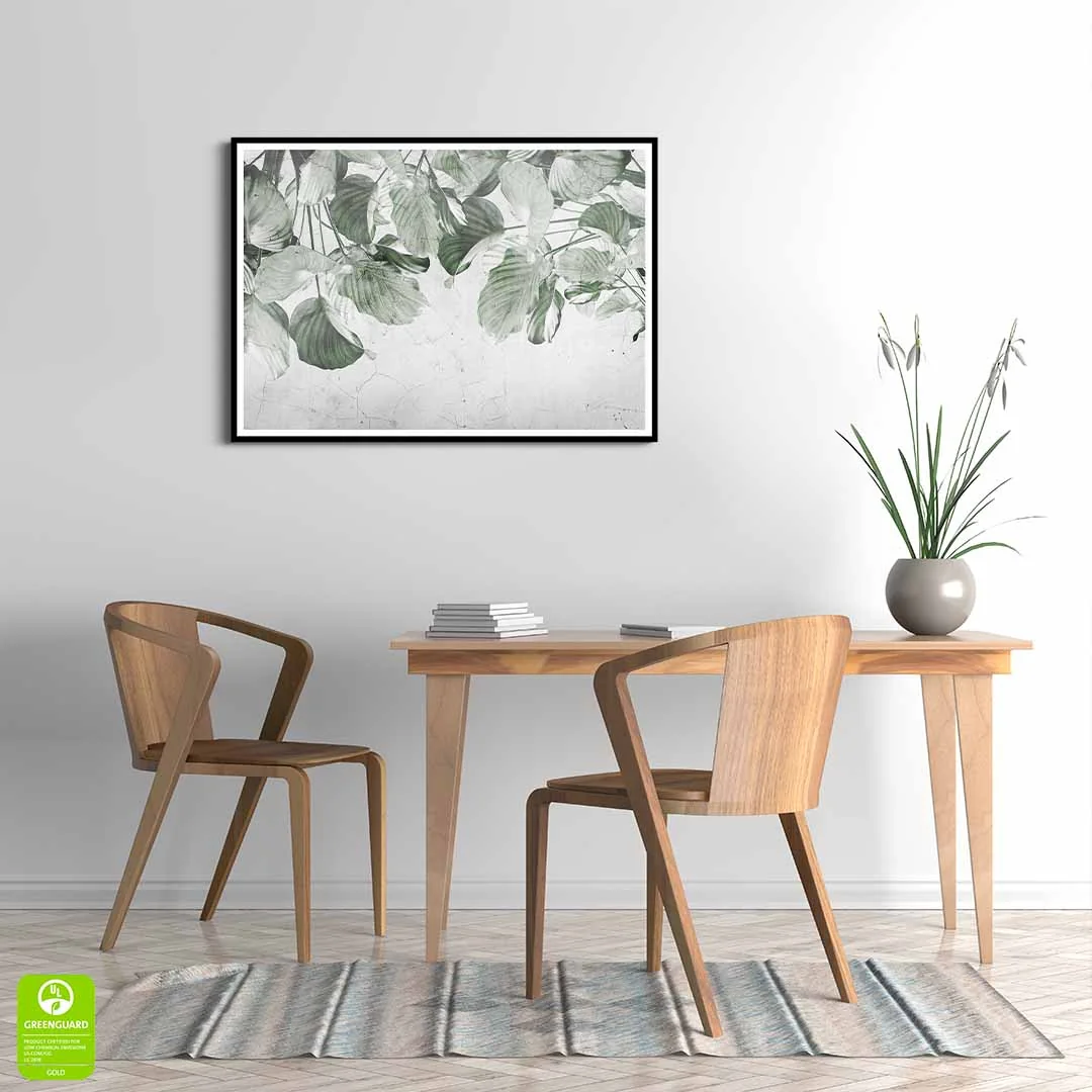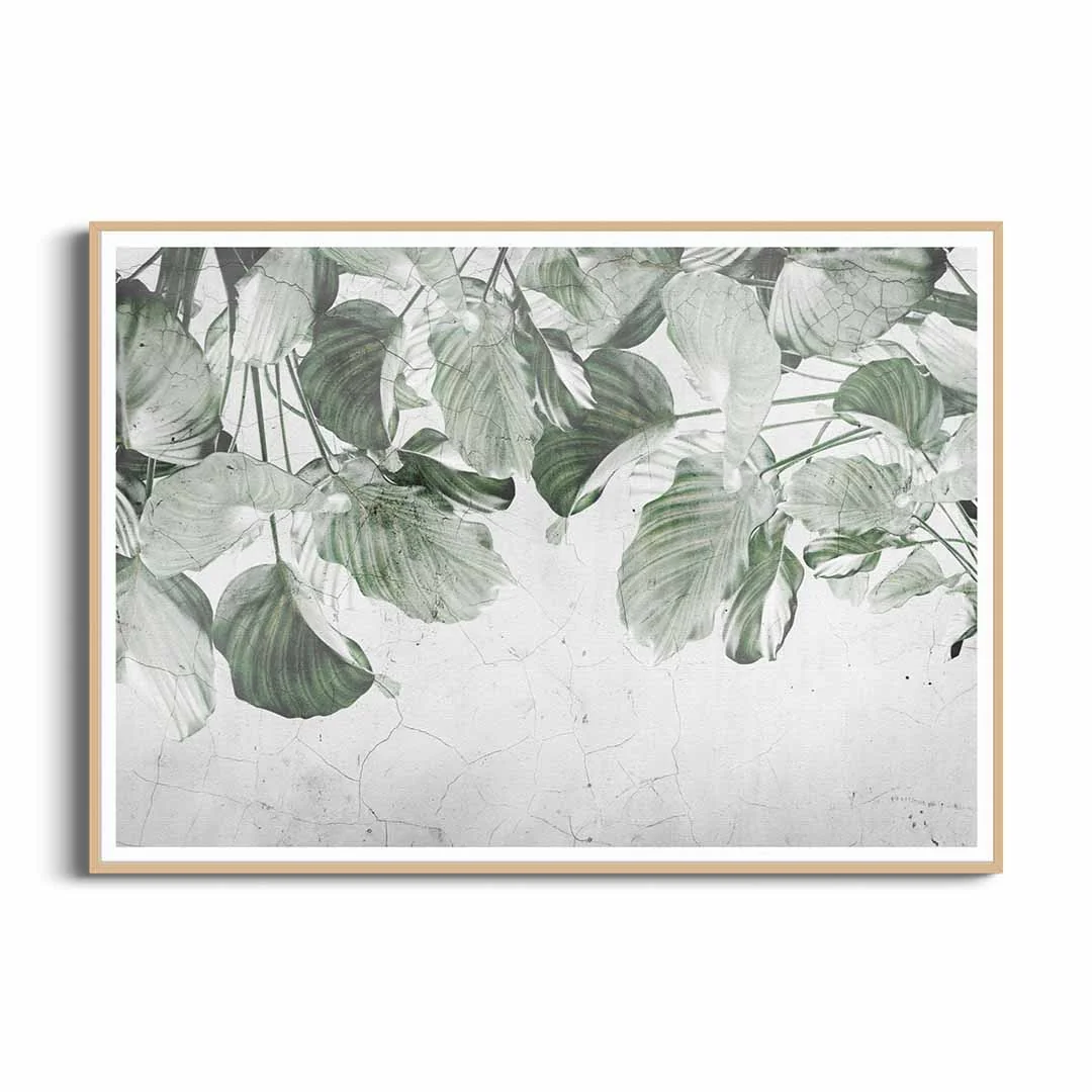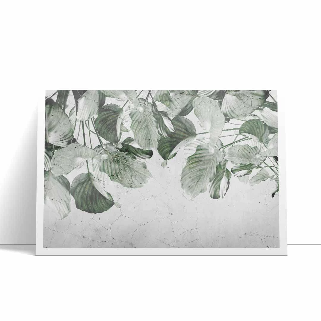 Plakat - "Liściasta zasłona" to propozycja dla miłośników klimatycznych wzorów botanicznych. Plakat prezentuje zwisające gałązki zielonych liści, tworzących piękną naturalną kurtynę z zielonych liści. Kolorystyka tego plakatu jest bardzo stonowana, nie ma tu soczystej zieleni, a raczej pastelowa delikatna zieleń w kilku odcieniach. Tło bardzo ciekawie zaprezentowane, w jasnych odcieniach koloru szarego ze strukturą przypominającą spękany beton. Ze względu na barwy i strukturę tła przypominającą surową ścianę motyw świetnie wpasuje się w styl loftowy, nowoczesny. Ciekawym rozwiązaniem może być również połączenie wzoru z drewnianymi dodatkami we wnętrzu.