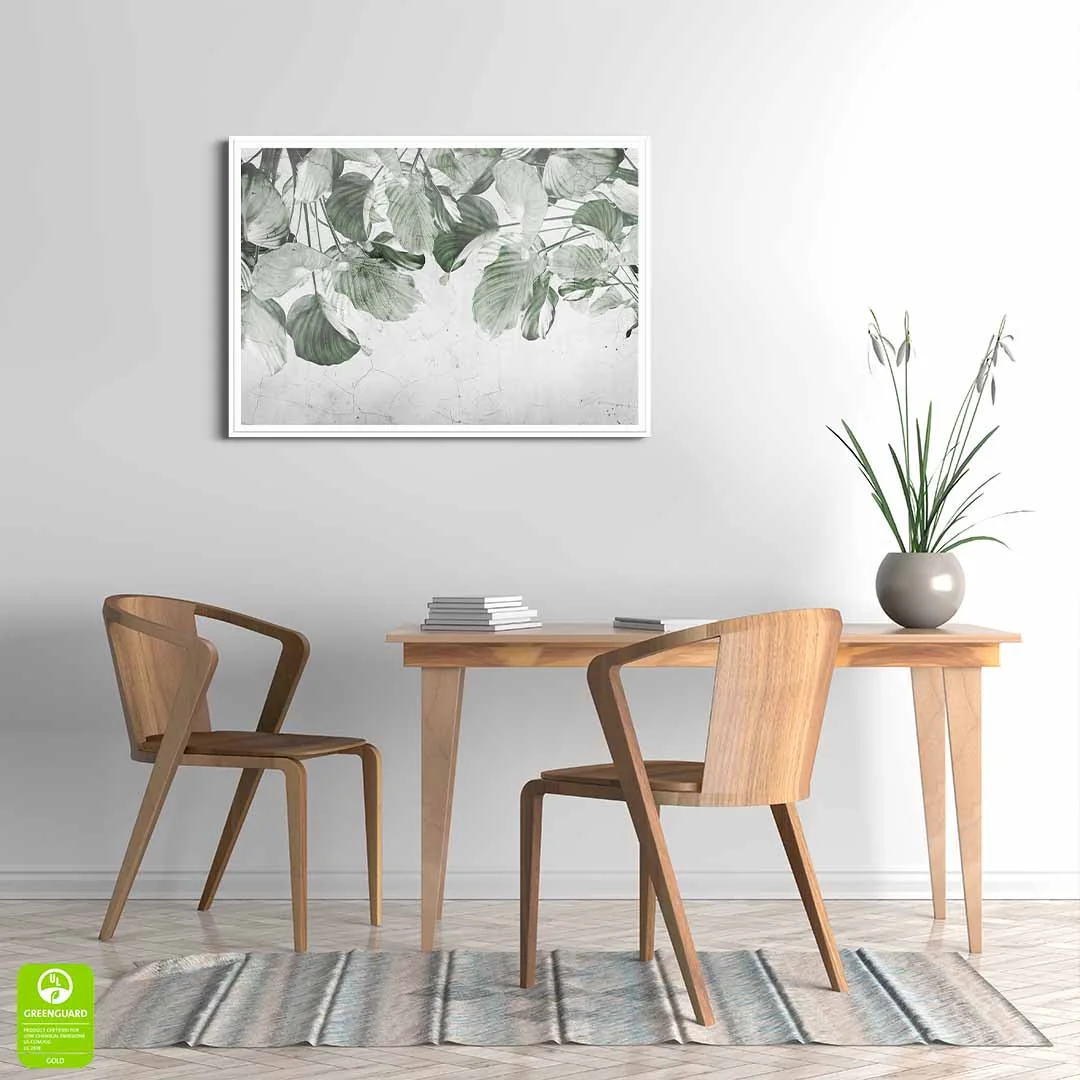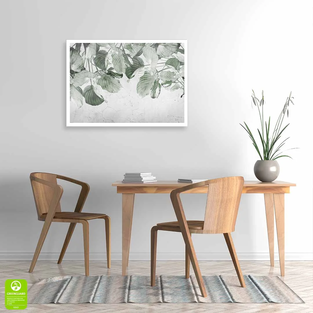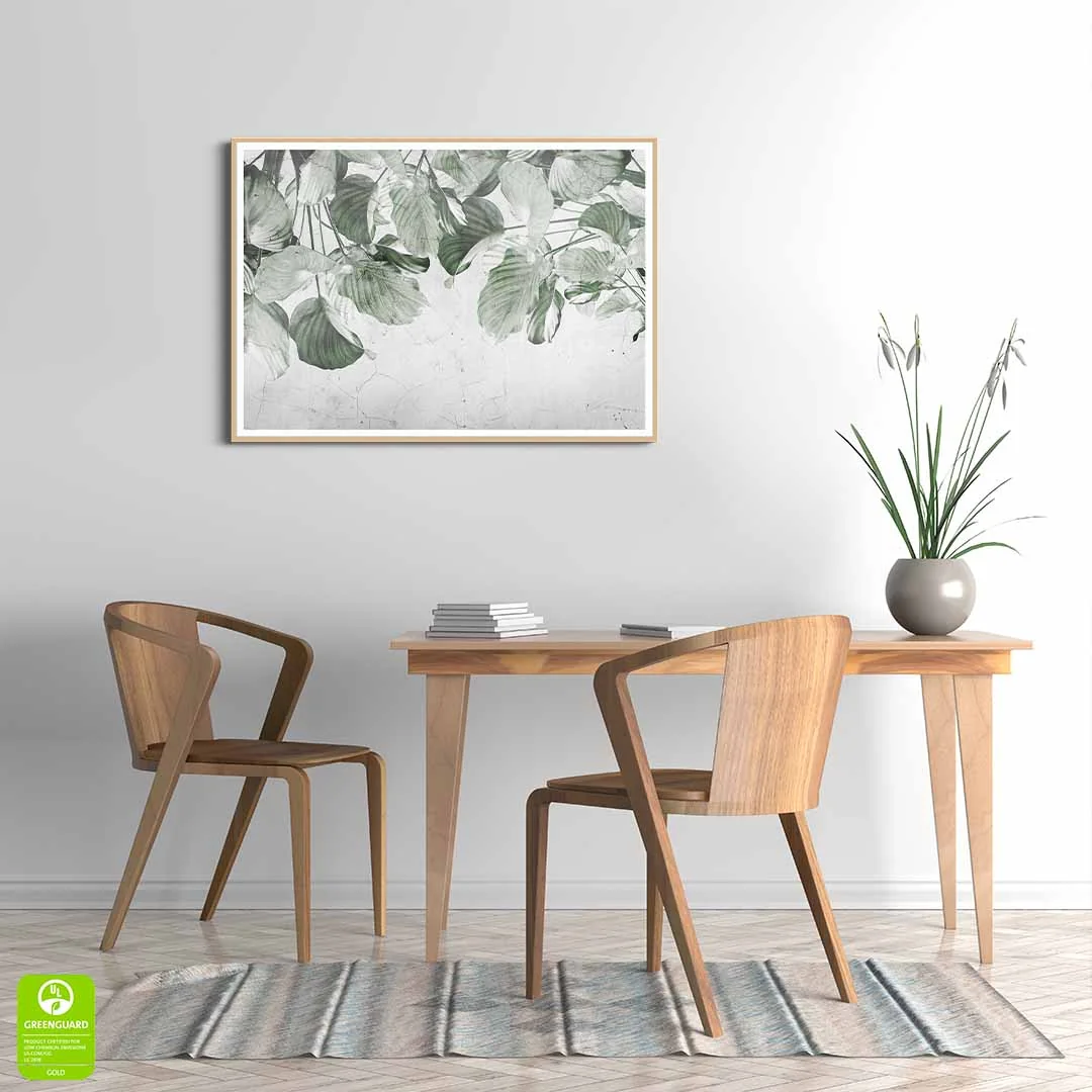 Plakat - "Liściasta zasłona" to propozycja dla miłośników klimatycznych wzorów botanicznych. Plakat prezentuje zwisające gałązki zielonych liści, tworzących piękną naturalną kurtynę z zielonych liści. Kolorystyka tego plakatu jest bardzo stonowana, nie ma tu soczystej zieleni, a raczej pastelowa delikatna zieleń w kilku odcieniach. Tło bardzo ciekawie zaprezentowane, w jasnych odcieniach koloru szarego ze strukturą przypominającą spękany beton. Ze względu na barwy i strukturę tła przypominającą surową ścianę motyw świetnie wpasuje się w styl loftowy, nowoczesny. Ciekawym rozwiązaniem może być również połączenie wzoru z drewnianymi dodatkami we wnętrzu.