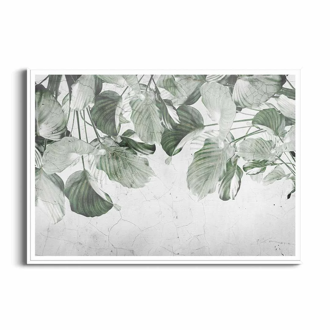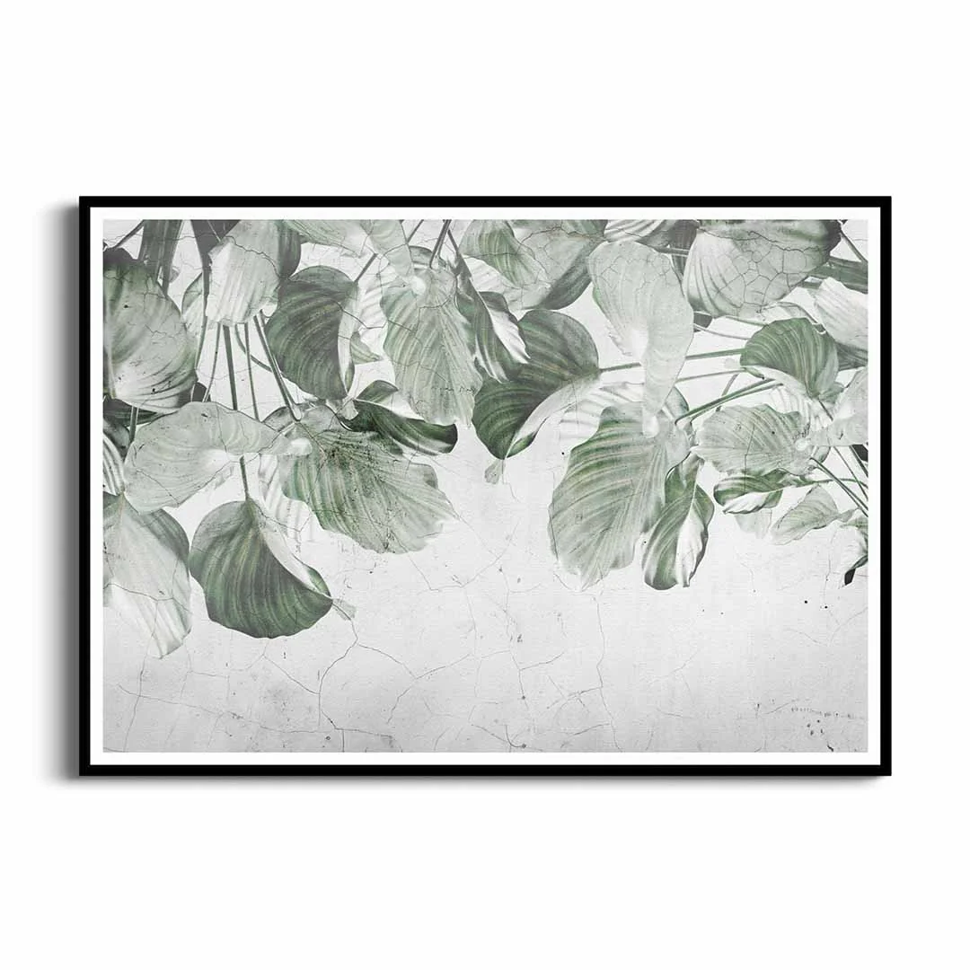 Plakat - „Liściasta zasłona” – zielony motyw roślinny z liśćmi na spękanym tle do salonu, sypialni lub biura