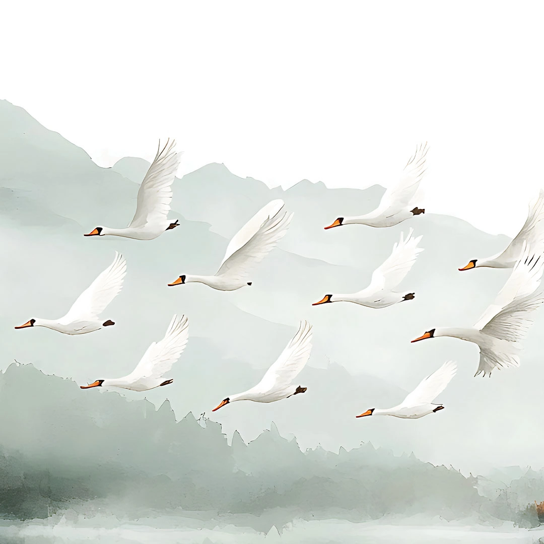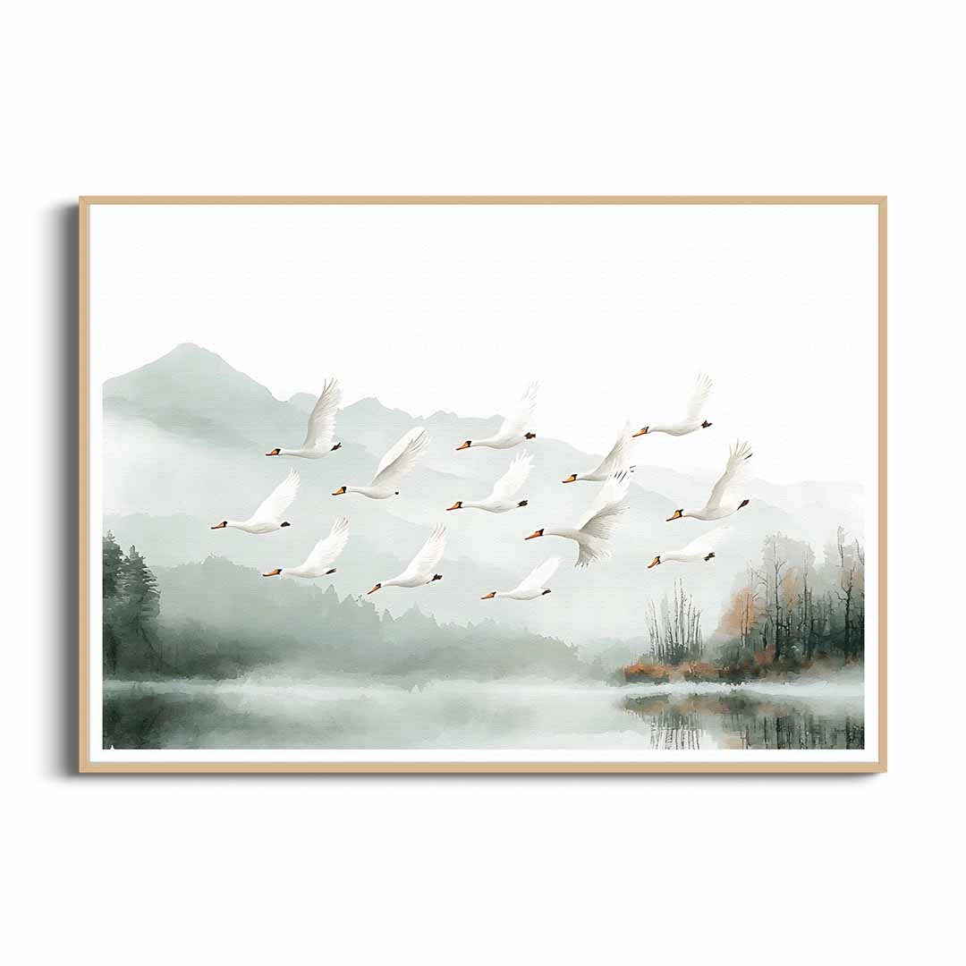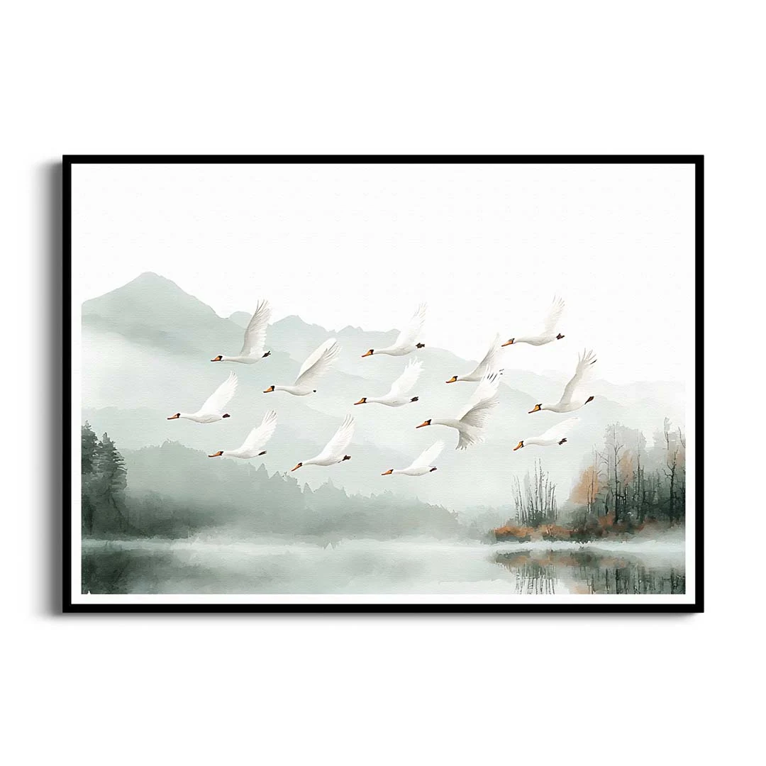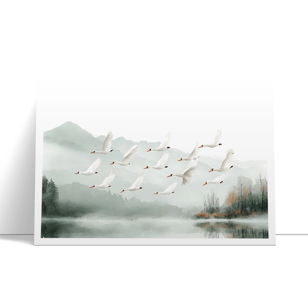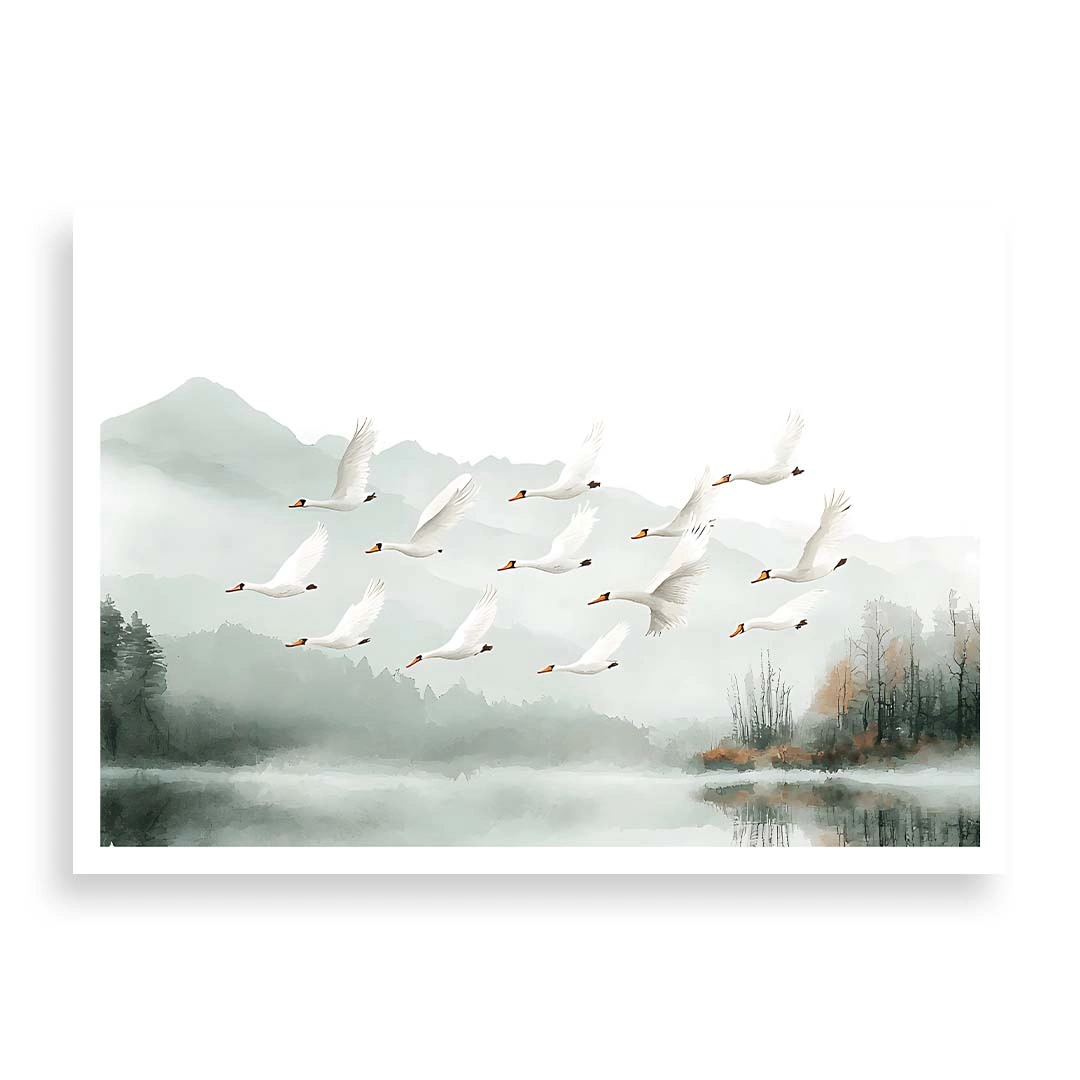 Plakat - "Łabędzie nad jeziorem" - malowniczy krajobraz z ptakami do salonu, sypialni lub łazienki