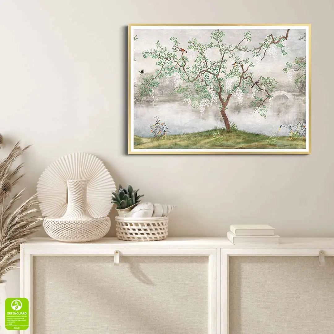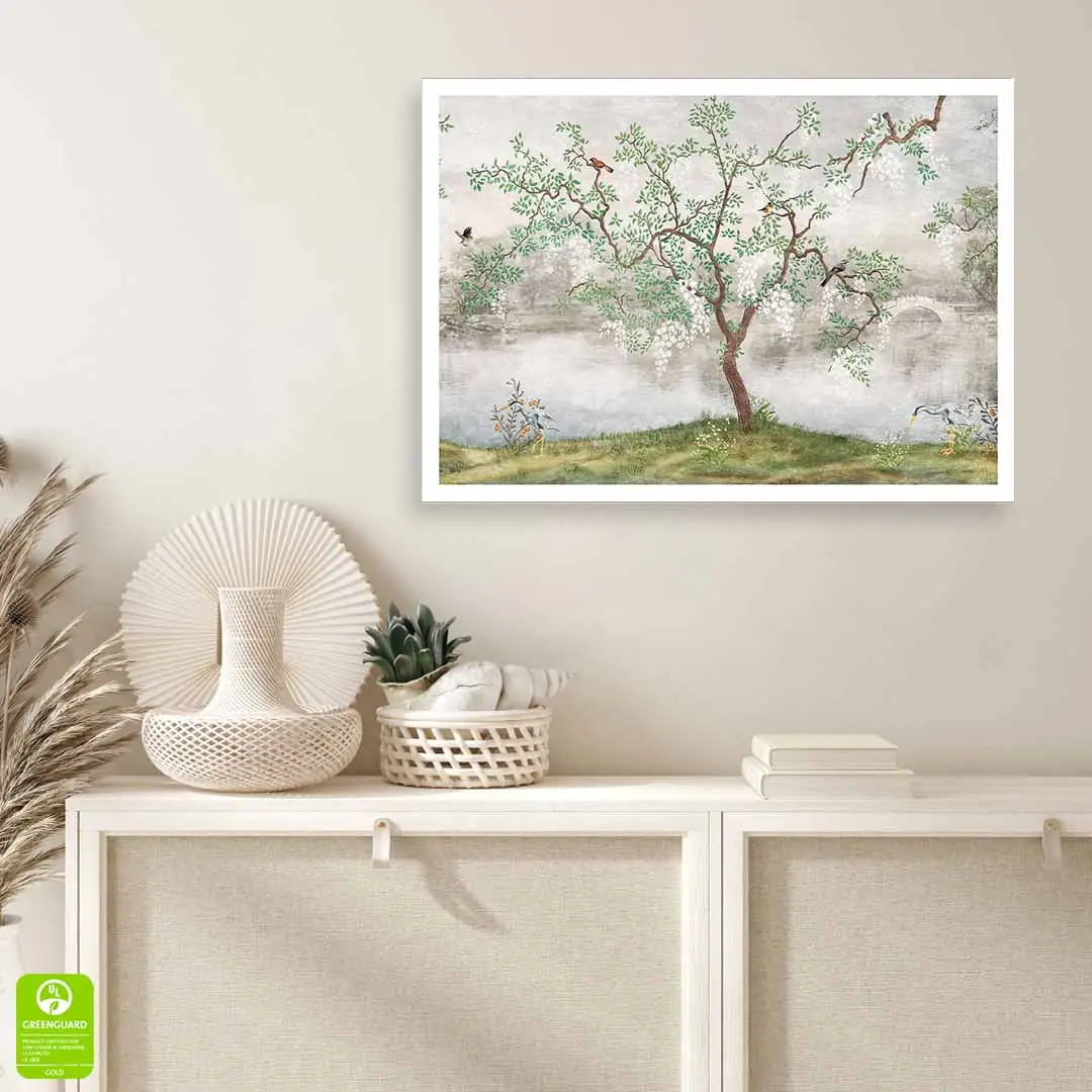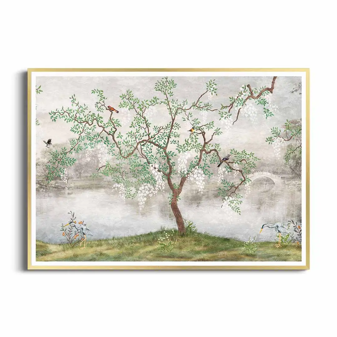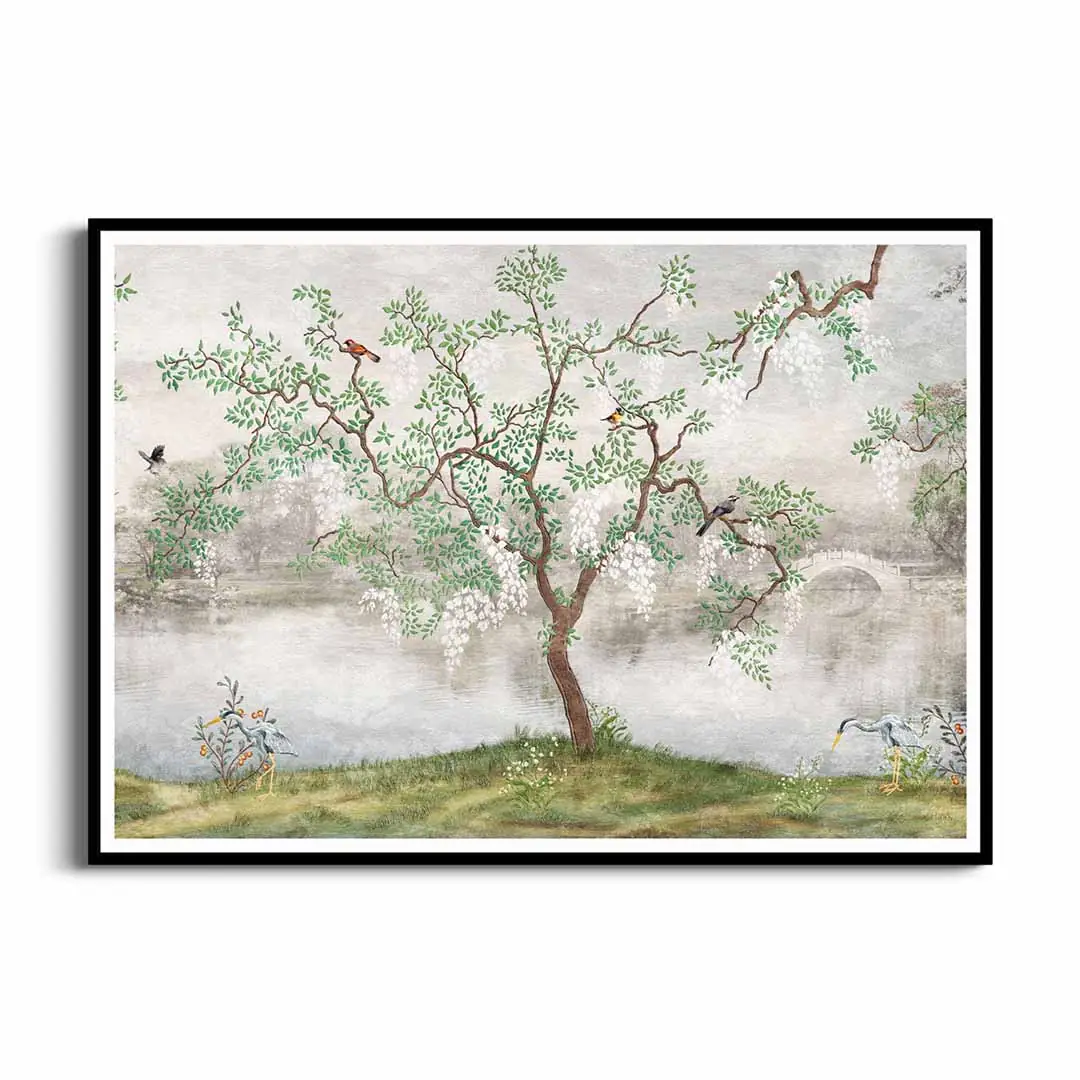 Plakat - Orientalny pejzaż z drzewem i ptakami