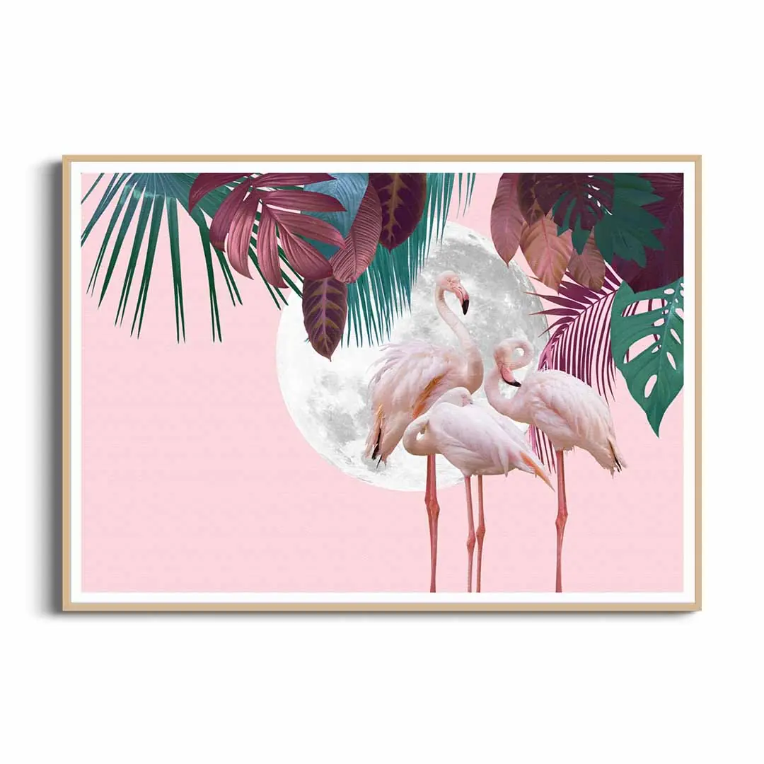 Plakat - Piękne flamingi na tle księżyca i tropikalnej roślinności