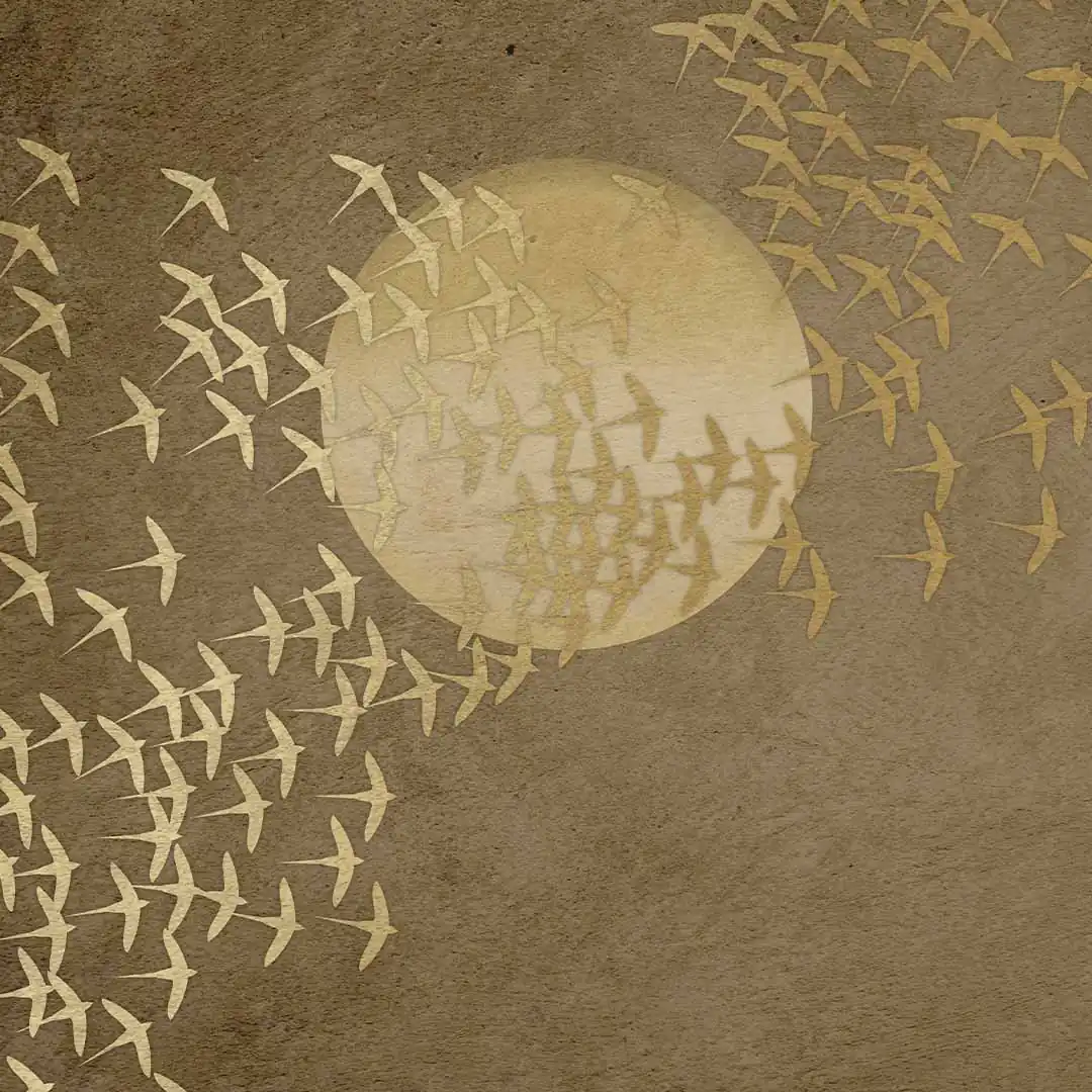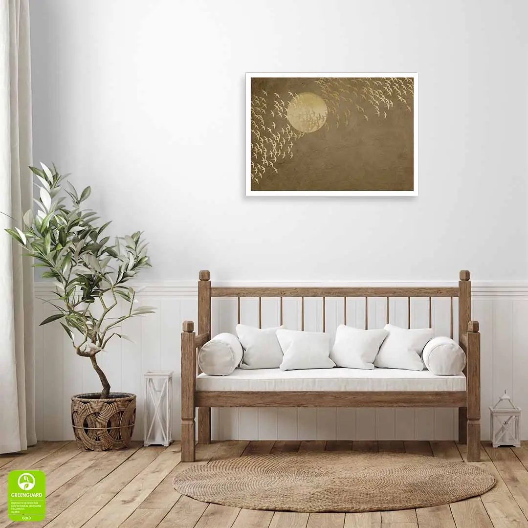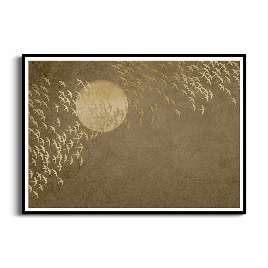 Plakat - W stronę słońca – złote sylwetki ptaków i słońce, styl japandi i nowoczesny