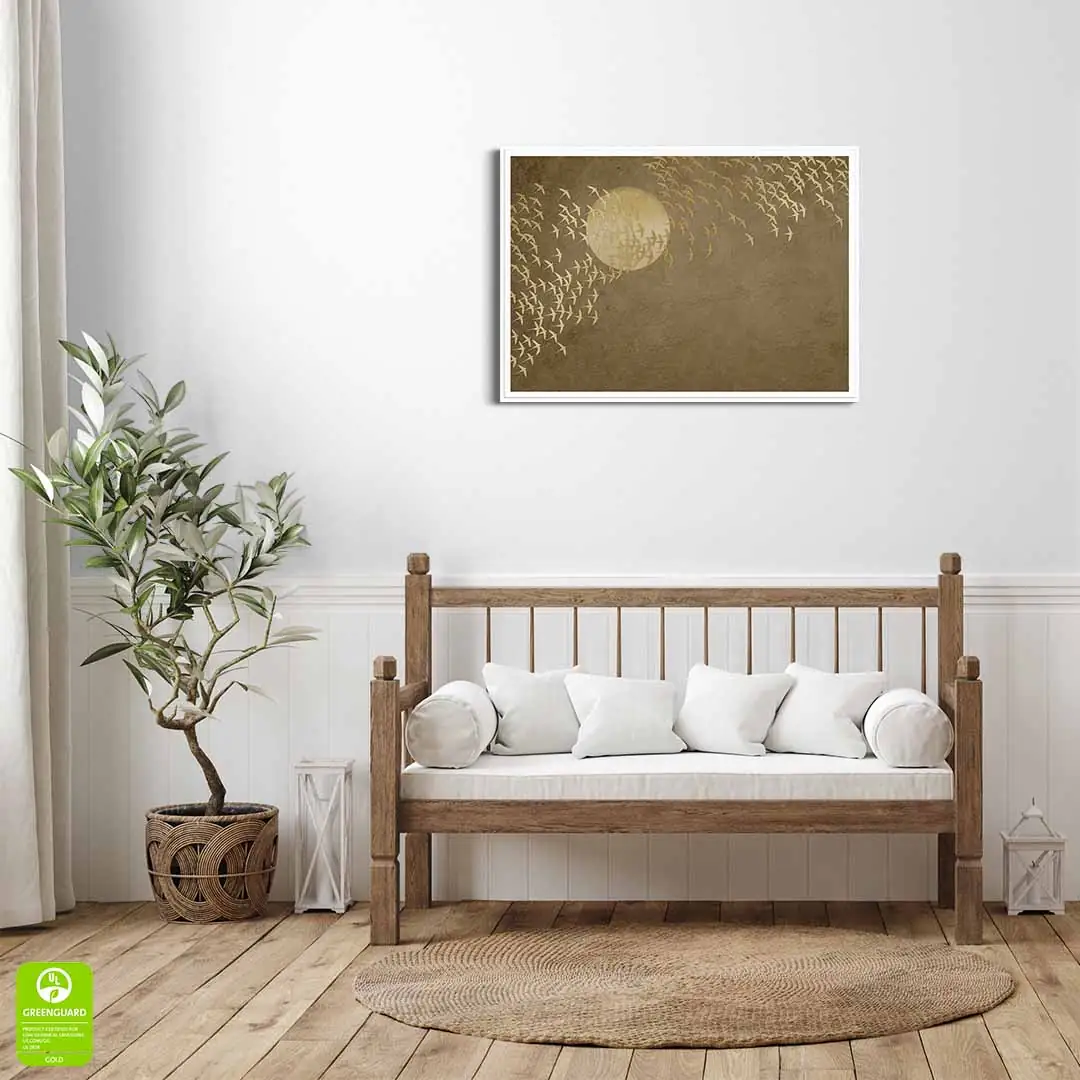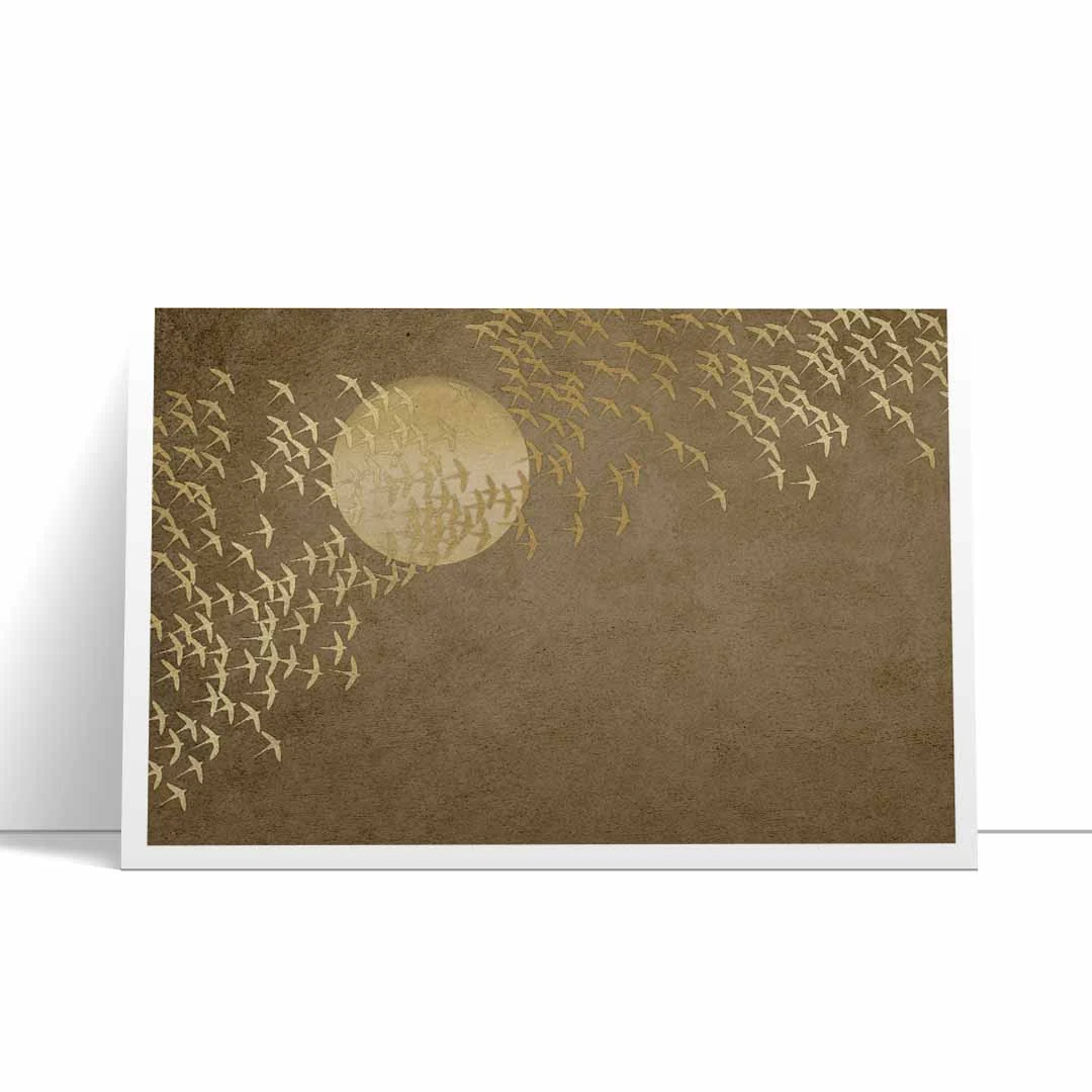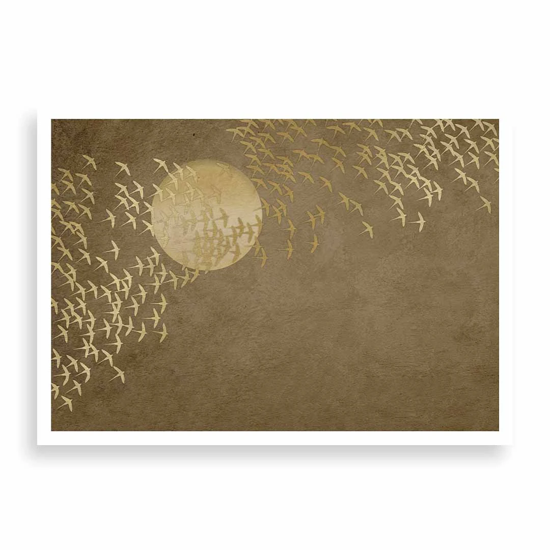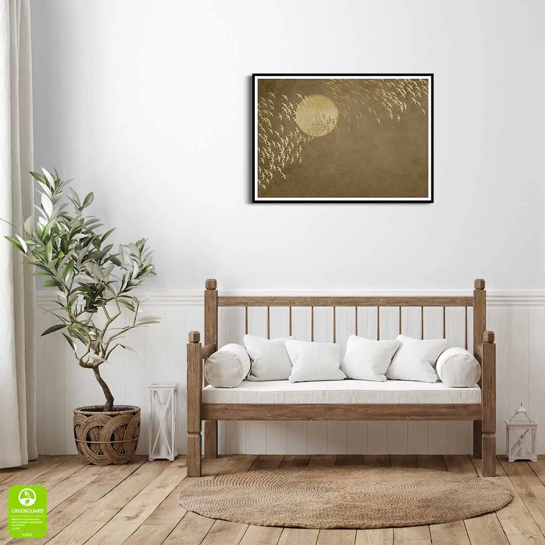 Plakat - W stronę słońca – złote sylwetki ptaków i słońce, styl japandi i nowoczesny