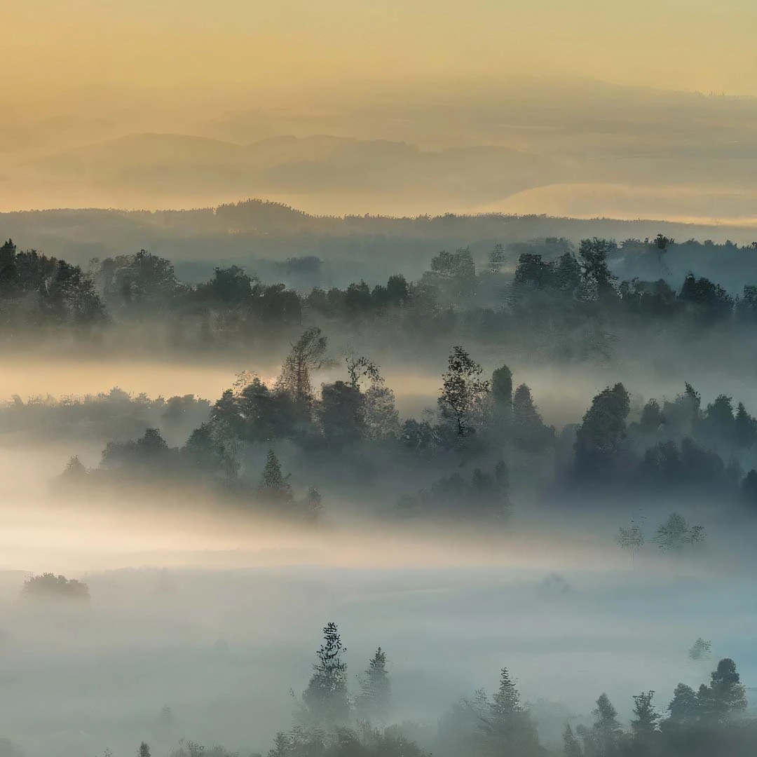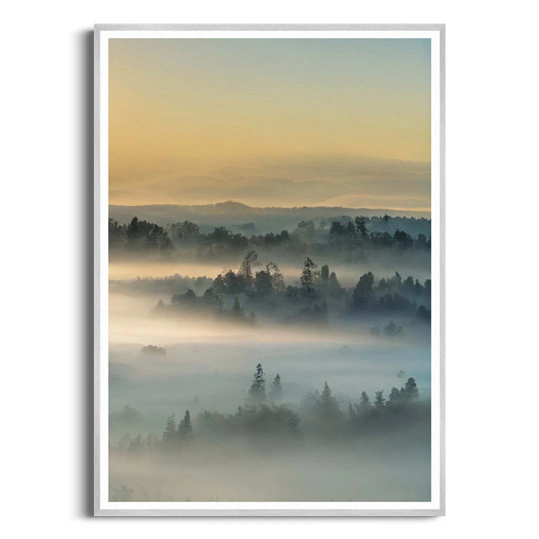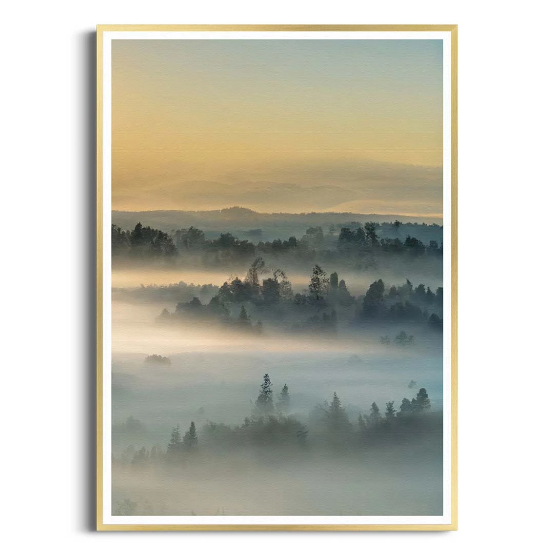 Plakat - Wschód słońca nad lasem we mgle III