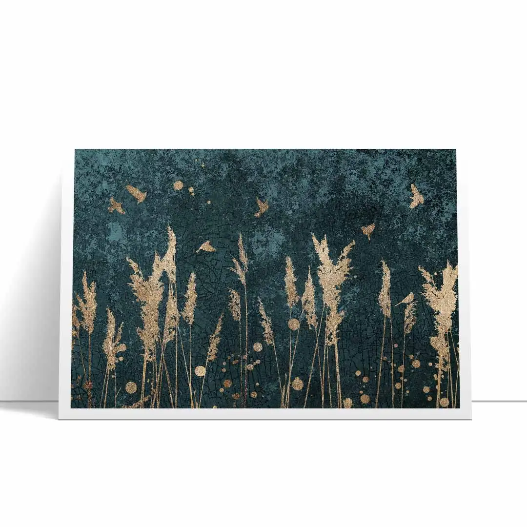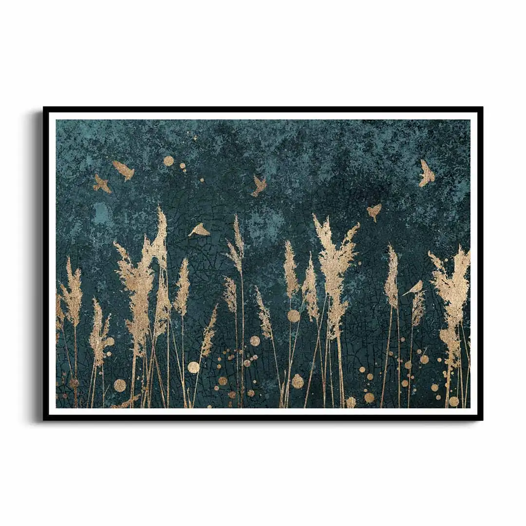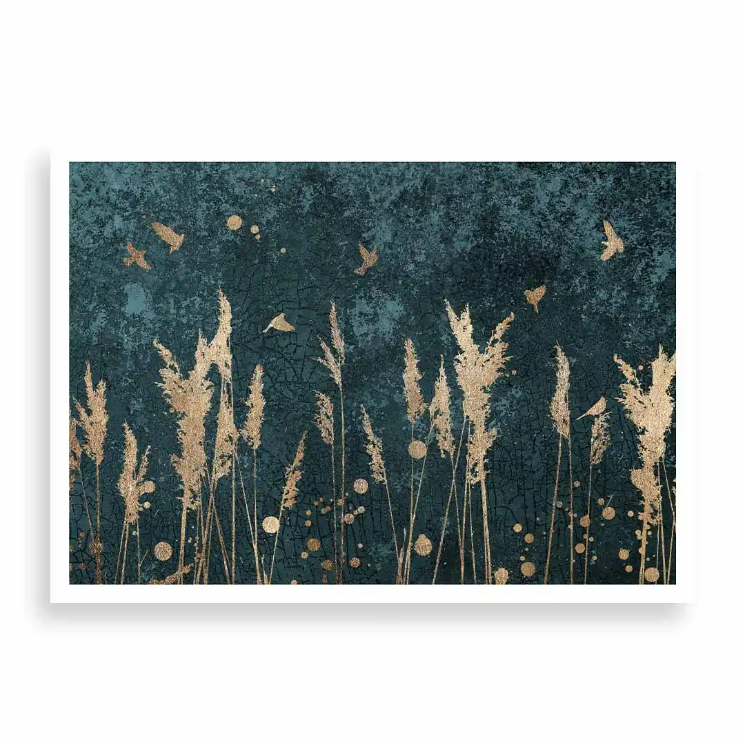Plakat - Złote trzciny i ptaki to doskonała propozycja dla osób ceniących oryginalne wzornictwo. Plakat ze względu na kolorystykę będzie ciekawym elementem wystroju wnętrza. Tło, ciemne, ma interesującą, mocno przetartą strukturę utrzymaną w tonacji zielononiebieskiej, na którym pięknie się prezentują delikatne ptaki i trawy w kolorze złota. Kolor złoty uzyskujemy przez wydruk, nie jest to złoto metalizowane czy pozłacane. Grafika doskonale prezentuje się w czarnej ramie, jak i ramie w kolorze drewna. Plakat będzie bardzo dobrze komponował się w wielu stylach wykończenia wnętrza od skandynawskiego, po rustykalny czy nowoczesny.