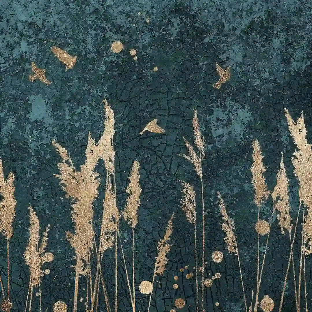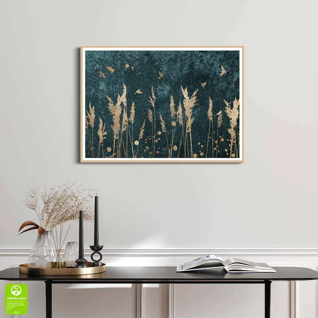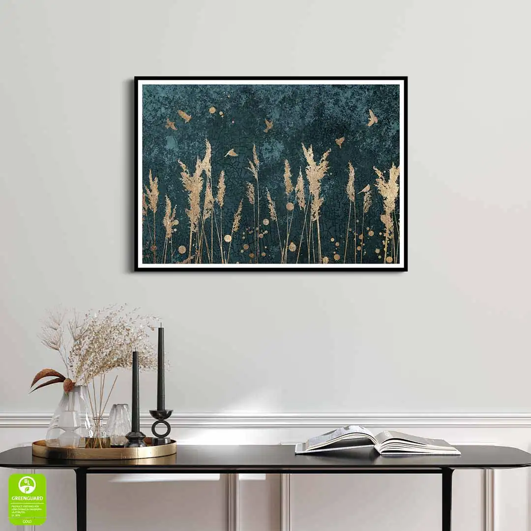 Plakat - Złote trzciny i ptaki to doskonała propozycja dla osób ceniących oryginalne wzornictwo. Plakat ze względu na kolorystykę będzie ciekawym elementem wystroju wnętrza. Tło, ciemne, ma interesującą, mocno przetartą strukturę utrzymaną w tonacji zielononiebieskiej, na którym pięknie się prezentują delikatne ptaki i trawy w kolorze złota. Kolor złoty uzyskujemy przez wydruk, nie jest to złoto metalizowane czy pozłacane. Grafika doskonale prezentuje się w czarnej ramie, jak i ramie w kolorze drewna. Plakat będzie bardzo dobrze komponował się w wielu stylach wykończenia wnętrza od skandynawskiego, po rustykalny czy nowoczesny.