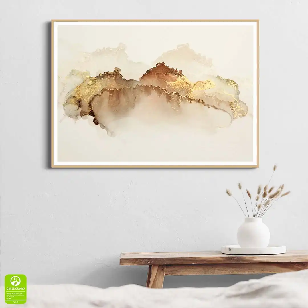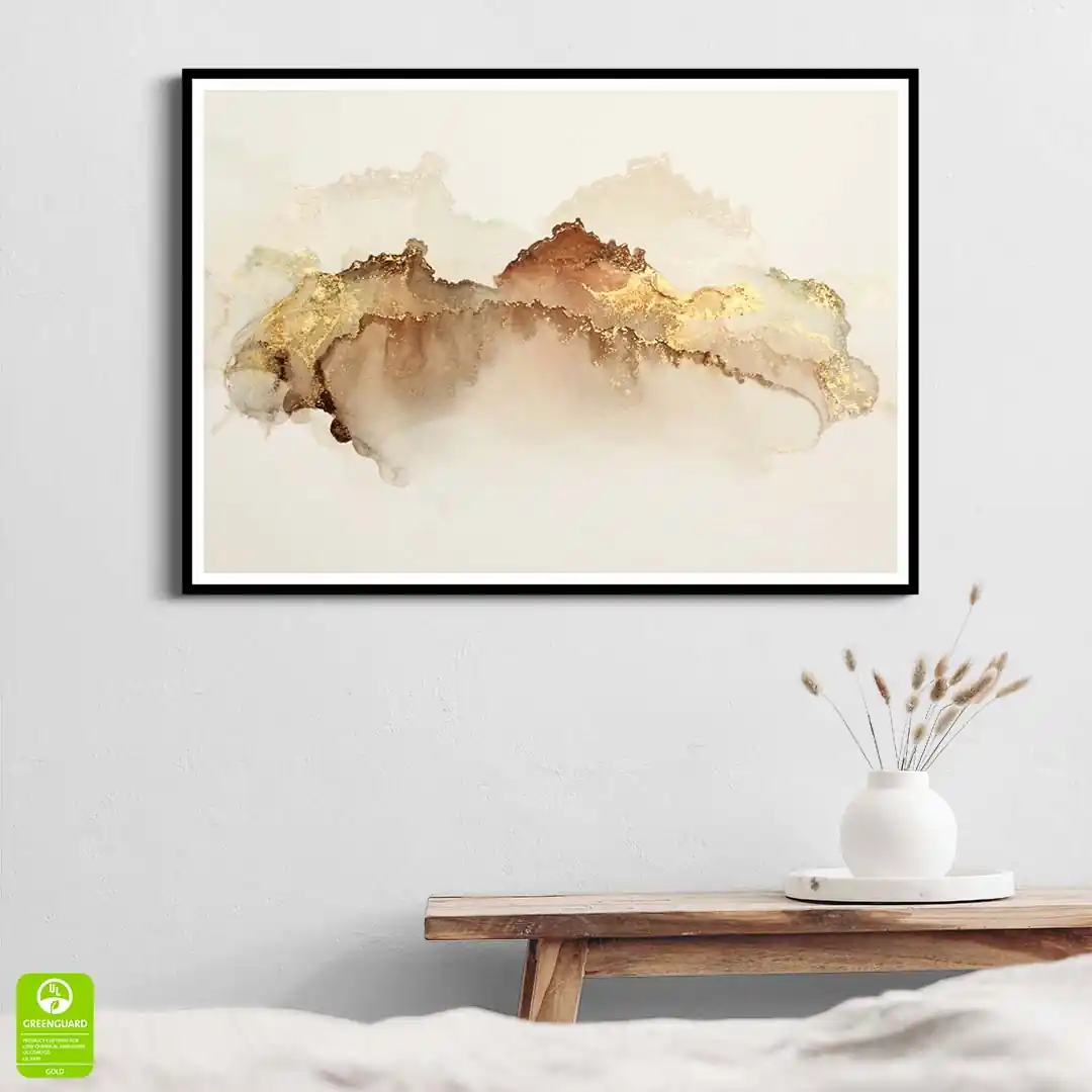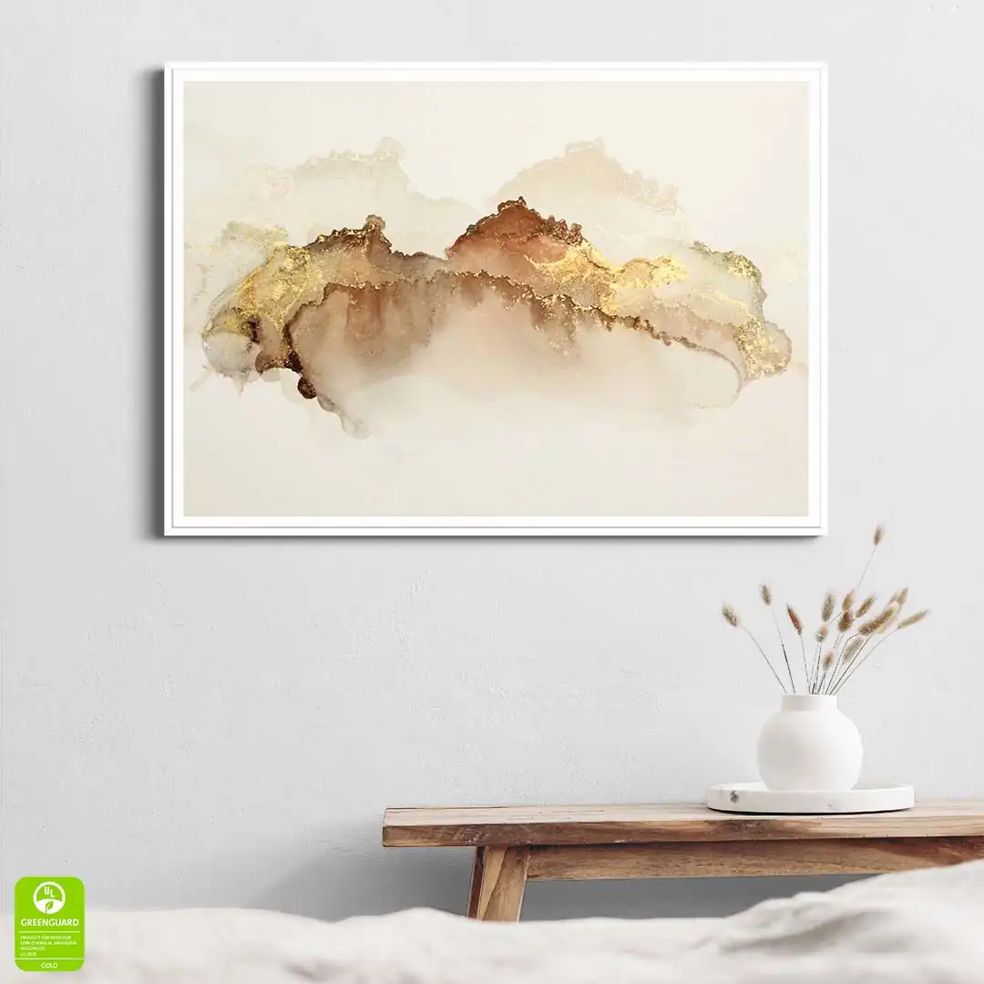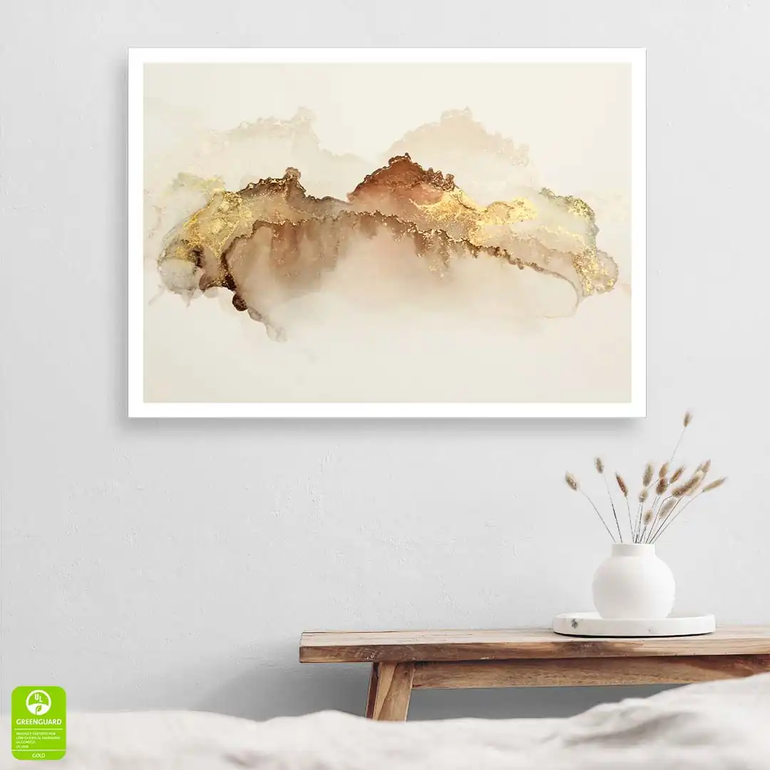 - techniką druku - proces drukowania wykorzystuje inne metody tworzenia kolorów (tzw. "przestrzeń barw") niż te, które stosowane są na ekranach komputera; kolory drukowane mogą wyglądać również nieco inaczej na różnych materiałach (np. canvasie, flizelinie, papierze czy szkle itp.) i przy użyciu różnych tuszy, w naszym przypadku tuszy do druku UV; złote elementy nie są wybiórczo metalizowane - efekt uzyskany jest poprzez wydruk tekstury w kolorze złota;