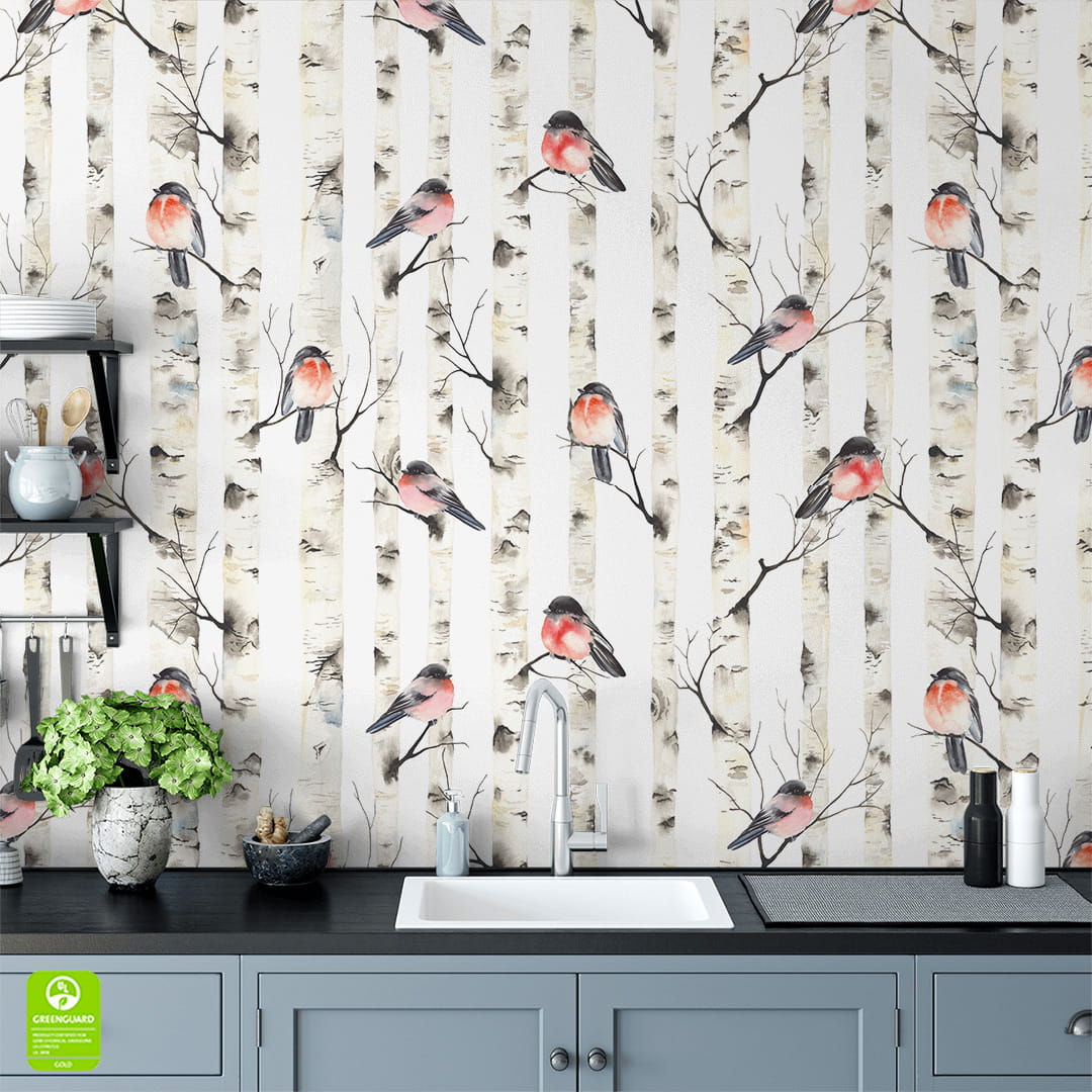 Tapeta na wymiar: Gile na Brzozach – Akwarelowy Motyw Natury, Styl Skandynawski i Boho do Salonu, Kuchni, Jadalni
