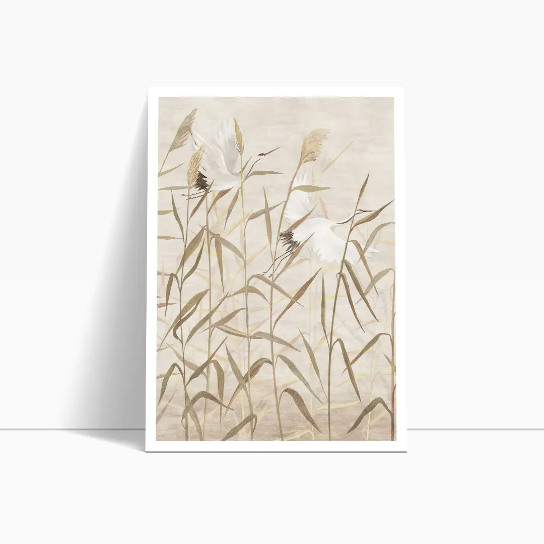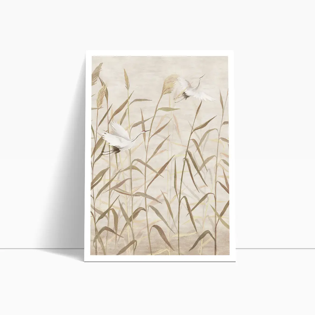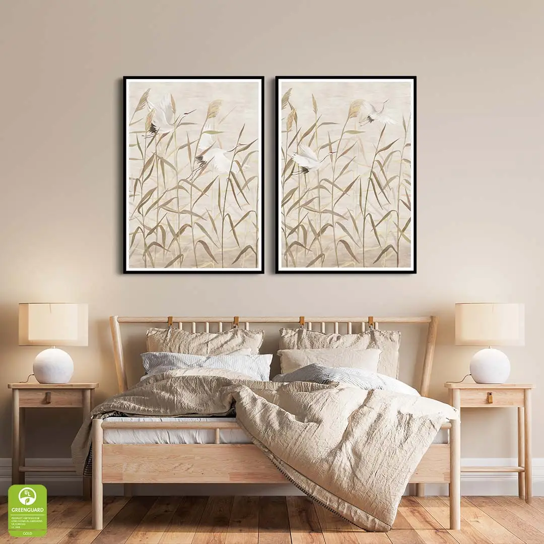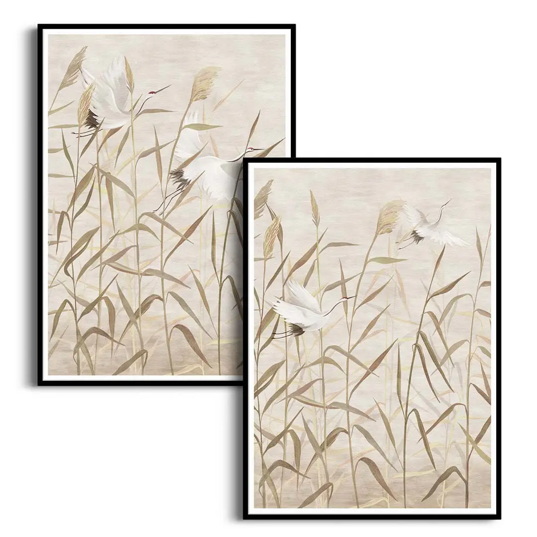 Zestaw 2 plakatów - Bociany w Trawach - Nowoczesne Obrazy do Sypialni i Salonu, Styl Boho i Japandi - Beż, Krem i Ciepły Brąz