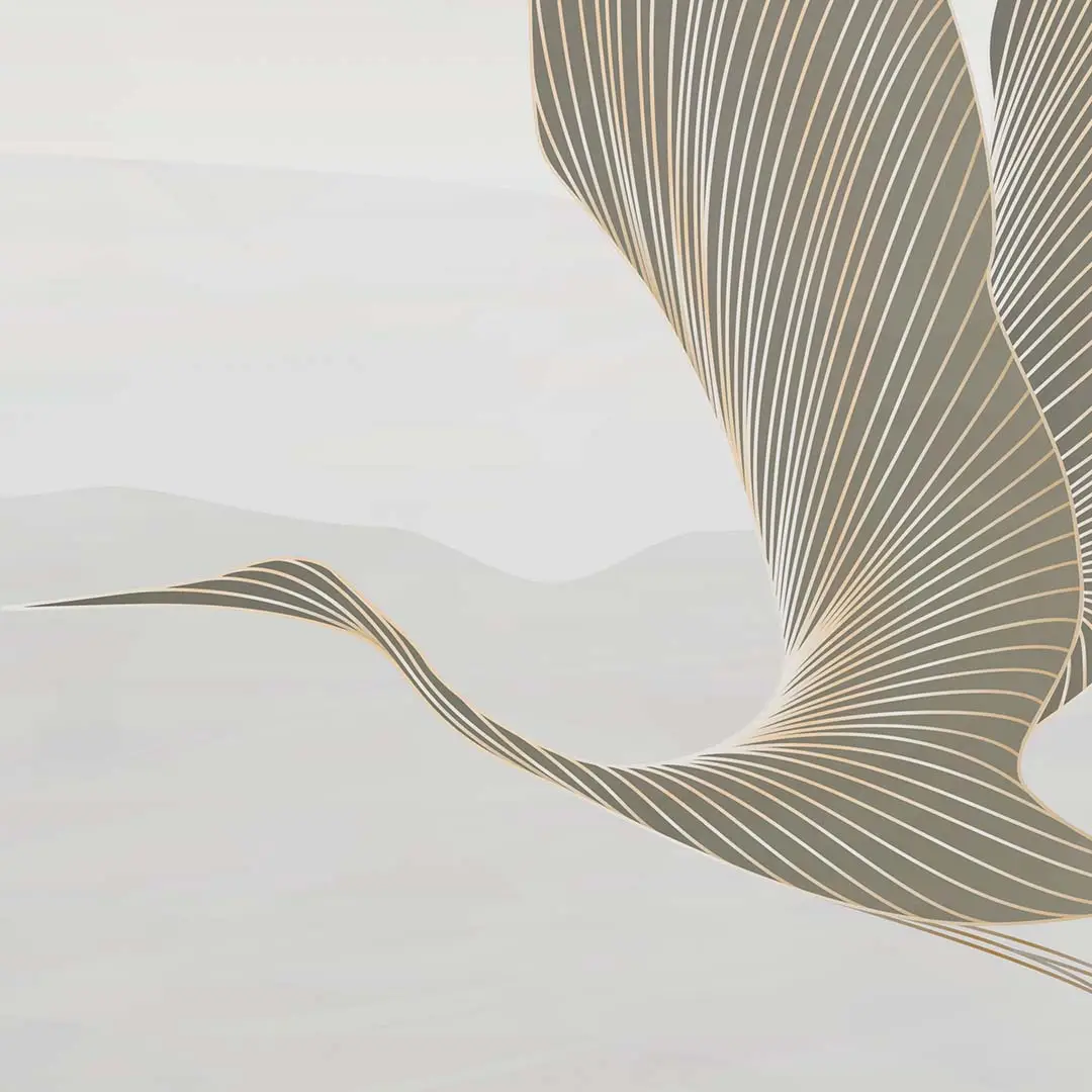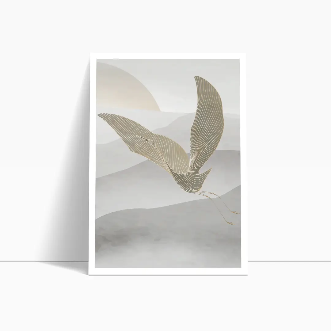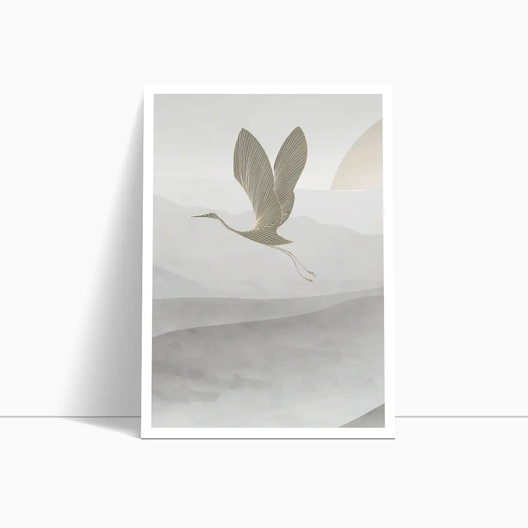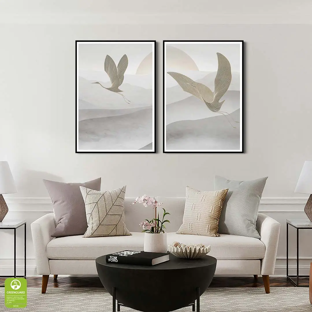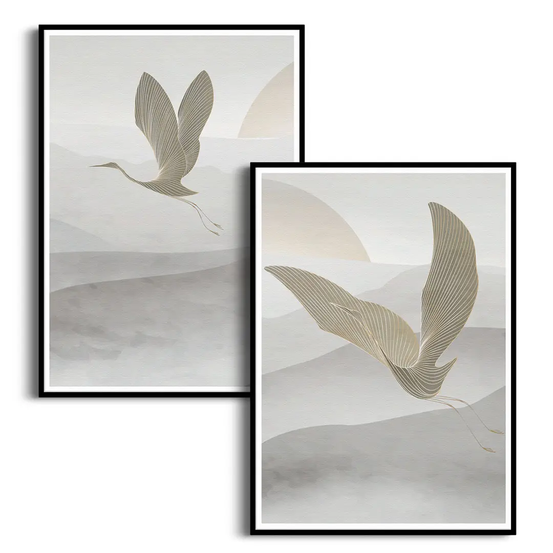 Zestaw 2 plakatów - Żurawie w locie na tle wzgórz i zachodzącego słońca