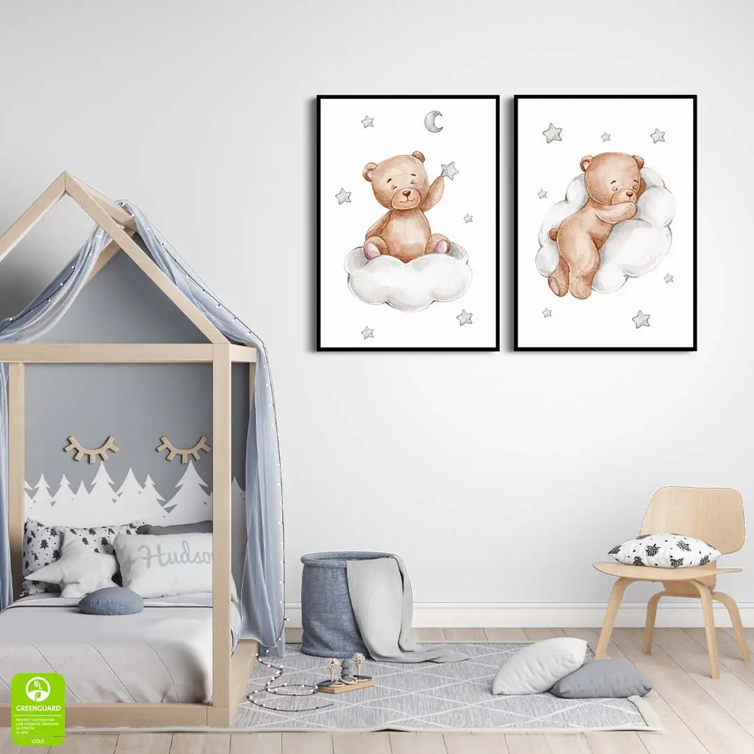 Zestaw idealnie komponuje się z wnętrzami w stylu skandynawskim, boho oraz nowoczesnym. Akwarelowy, miękki motyw misiów odpoczywających na puszystych chmurkach działa kojąco, tworząc w domu prywatną oazę spokoju. To idealny wybór nad łóżeczko niemowlaka lub do kącika zabaw dziecka – wszędzie tam, gdzie chcesz stworzyć estetyczną, pełną czułości przestrzeń dla swojego dziecka.
