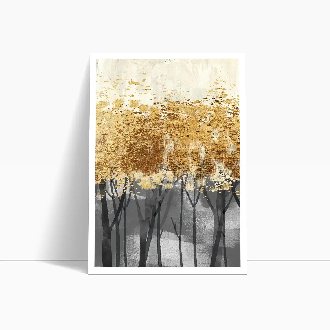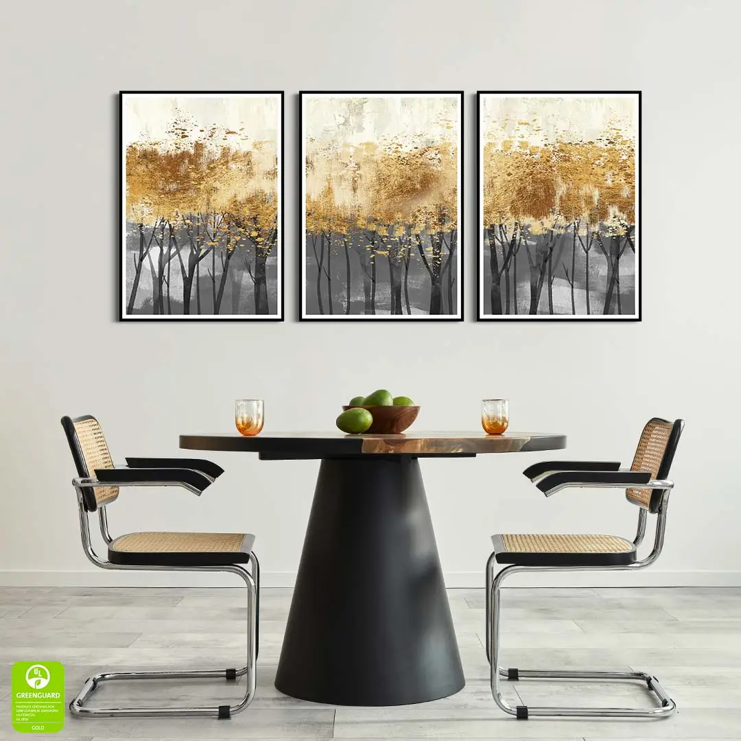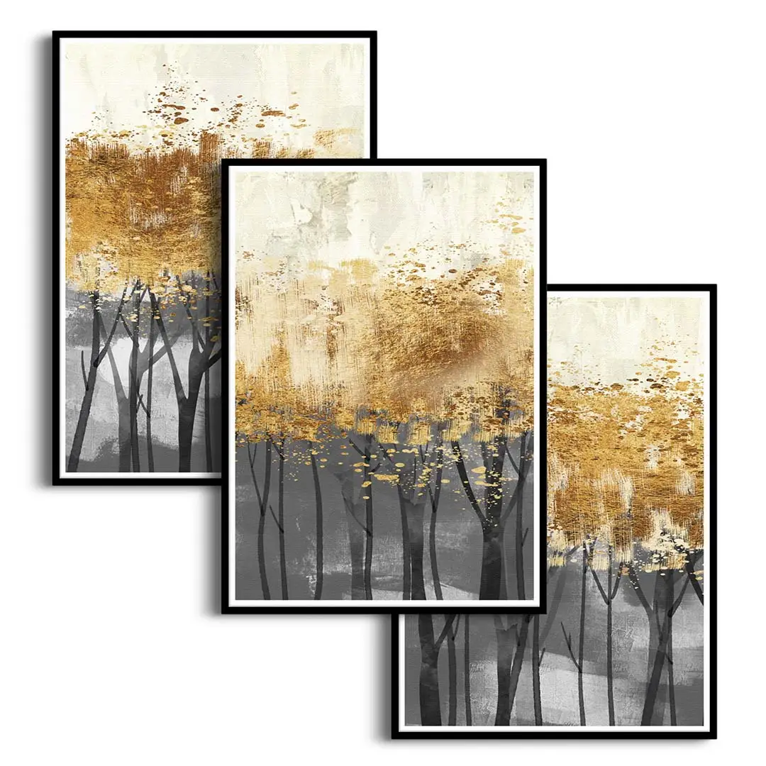 Zestaw 3 plakatów - Abstrakcja złoty las – Nowoczesna dekoracja do salonu, styl glamour i industrialny, elegancka sypialnia