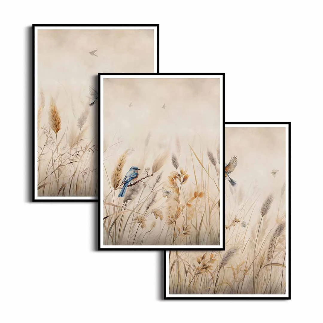 Zestaw plakatów - Natura - Łąka z ptakami - Tryptyk - Subtelna dekoracja do sypialni, salonu lub jadalni, styl rustykalny, boho