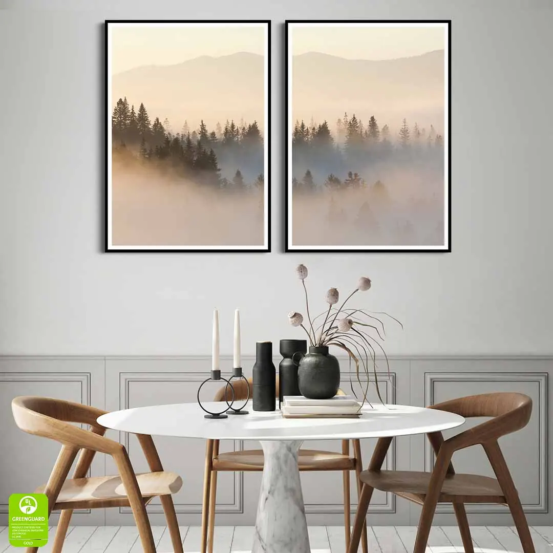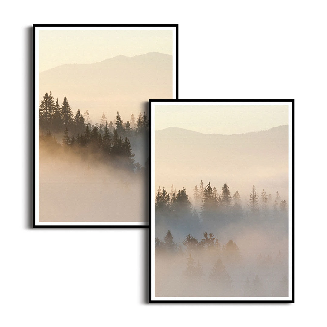 Zestaw plakatów – Zamglony las i góry - Widok, pejzaż, krajobraz las we mgle - to idealny wybór, jeśli chcesz dodać swojemu wnętrzu spokoju i sielskiego ciepła. Te obrazy pokazują piękny, naturalny widok, który pozwala odpocząć i wyciszyć się po całym dniu. Jasna i ciepła kolorystyka sprawia, że pokój staje się bardziej przytulny i jasny. Dekoracja świetnie pasuje do wnętrz urządzonych naturalnie – z drewnianymi meblami i jasnymi dodatkami. To prosta i szybka zmiana, która odmieni Twoją jadalnię lub sypialnię.