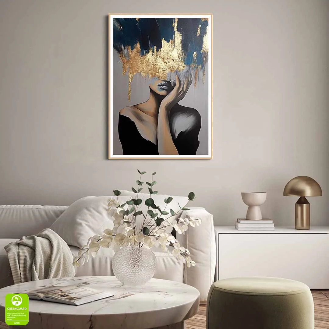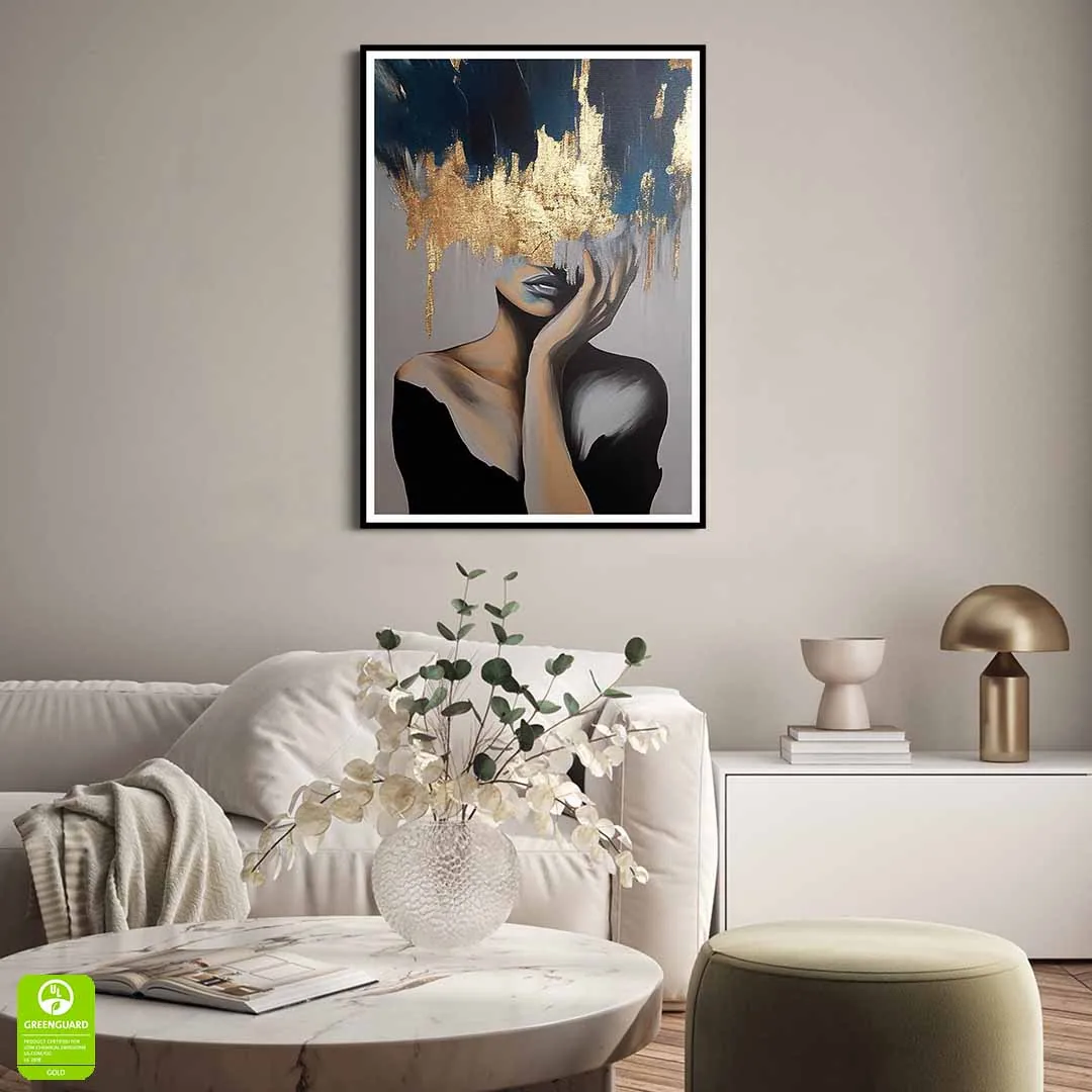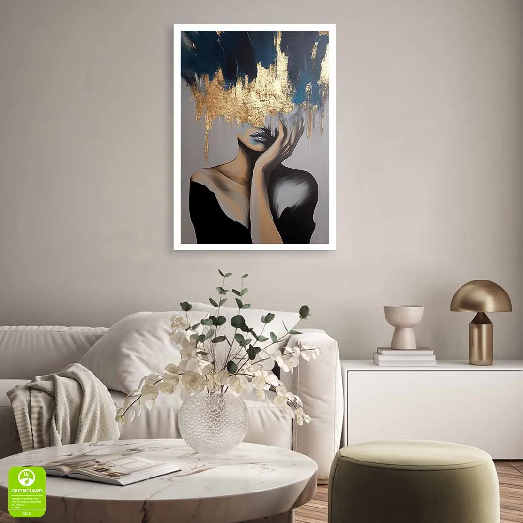Sztuka powinna wywoływać emocje, a ta grafika robi to w niezwykle wyrafinowany sposób. Nasz plakat Portret kobiety za złotą zasłoną to połączenie kobiecego piękna z bogactwem złotej tekstury. Subtelnie ukryta twarz modelki, przysłonięta mieniącą się materią, wprowadza do wnętrza aurę niedopowiedzenia i zmysłowości. Kontrast ciepłego złota z ciemniejszym tłem sprawia, że dekoracja ta przyciąga wzrok, nadając pomieszczeniu ekskluzywny sznyt i artystyczną głębię, obok której nie sposób przejść obojętnie.