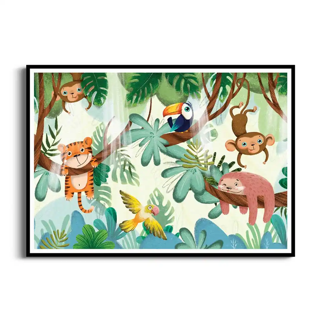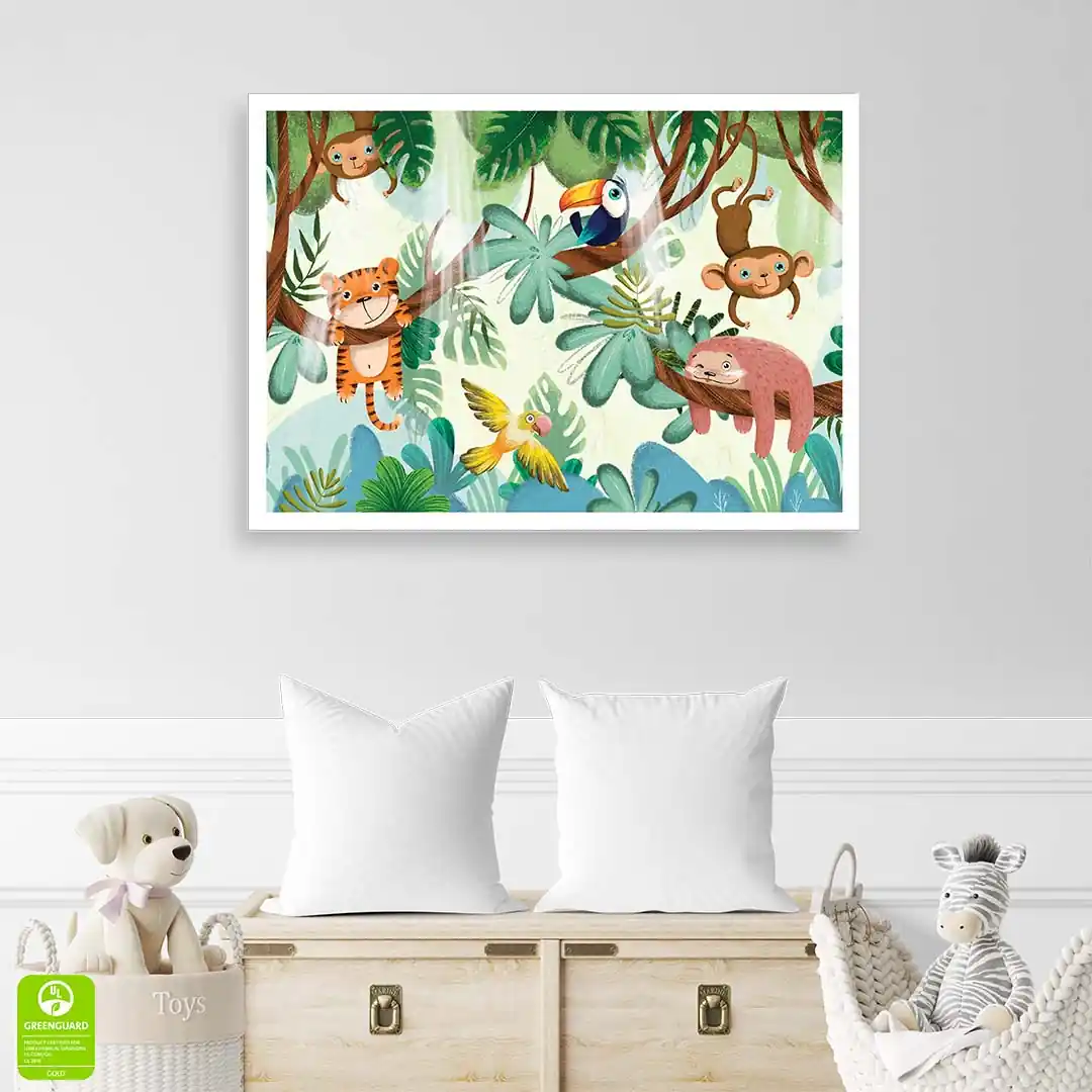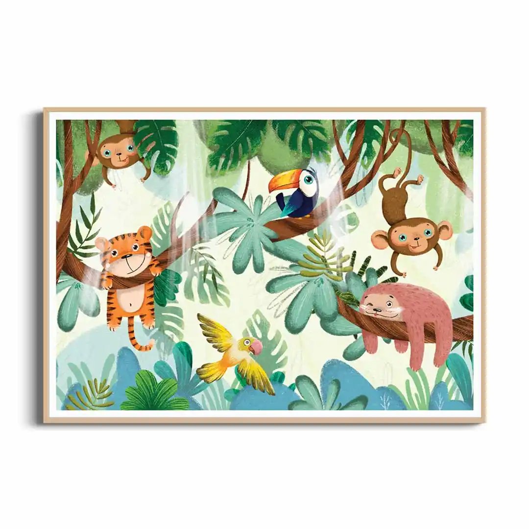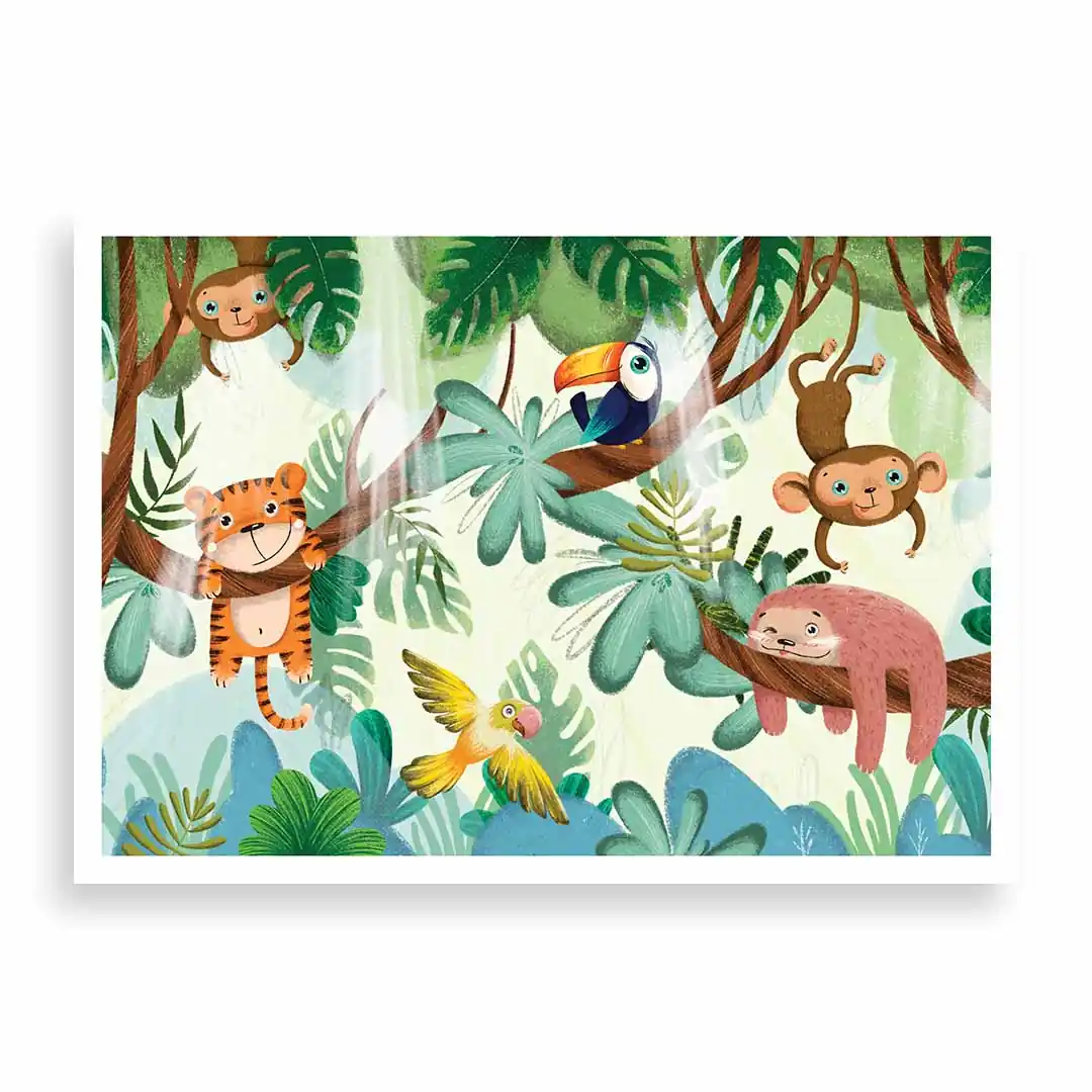 Zamień pokój swojego dziecka w tętniący życiem, zaczarowany las, gdzie nuda nigdy nie zagląda. Plakat Zwierzęta bawiące się na drzewach to pełna uroku i humoru kompozycja, która natychmiast wywołuje uśmiech na twarzy. Ilustracja przedstawia wesołą gromadkę leśnych przyjaciół, którzy beztrosko dokazują wśród gałęzi, zachęcając małego odkrywcę do własnych harców i kreatywnej zabawy. Ciepła kolorystyka i sympatyczne wizerunki zwierzątek sprawiają, że grafika ta wprowadza do wnętrza mnóstwo pozytywnej energii, stając się idealnym tłem dla codziennych przygód Twojej pociechy.