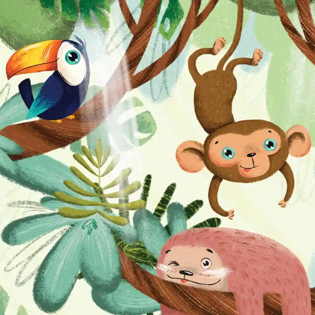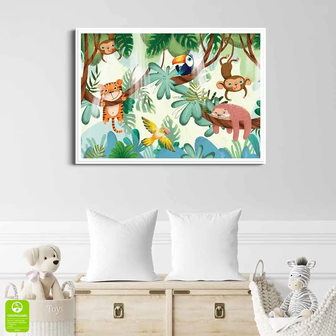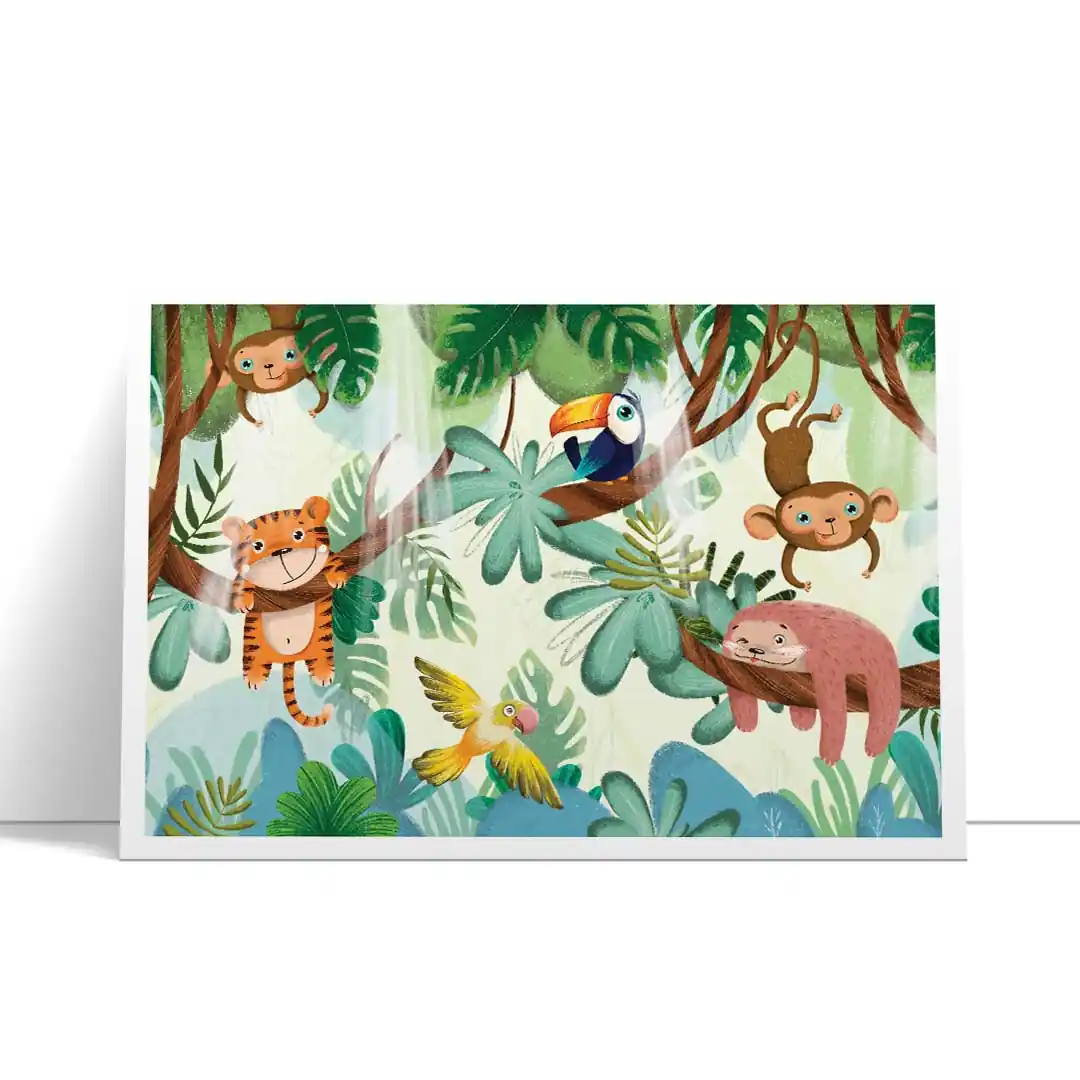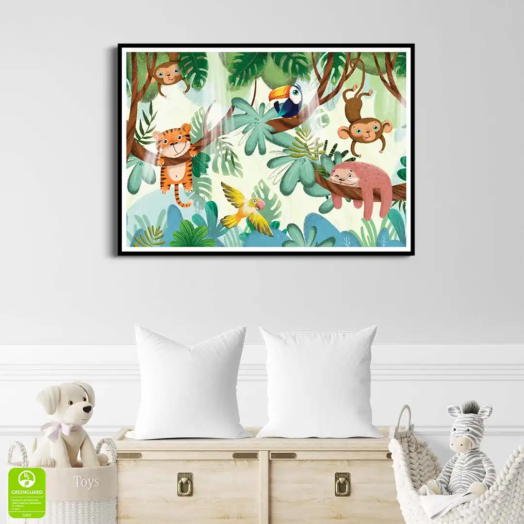 Zamień pokój swojego dziecka w tętniący życiem, zaczarowany las, gdzie nuda nigdy nie zagląda. Plakat Zwierzęta bawiące się na drzewach to pełna uroku i humoru kompozycja, która natychmiast wywołuje uśmiech na twarzy. Ilustracja przedstawia wesołą gromadkę leśnych przyjaciół, którzy beztrosko dokazują wśród gałęzi, zachęcając małego odkrywcę do własnych harców i kreatywnej zabawy. Ciepła kolorystyka i sympatyczne wizerunki zwierzątek sprawiają, że grafika ta wprowadza do wnętrza mnóstwo pozytywnej energii, stając się idealnym tłem dla codziennych przygód Twojej pociechy.