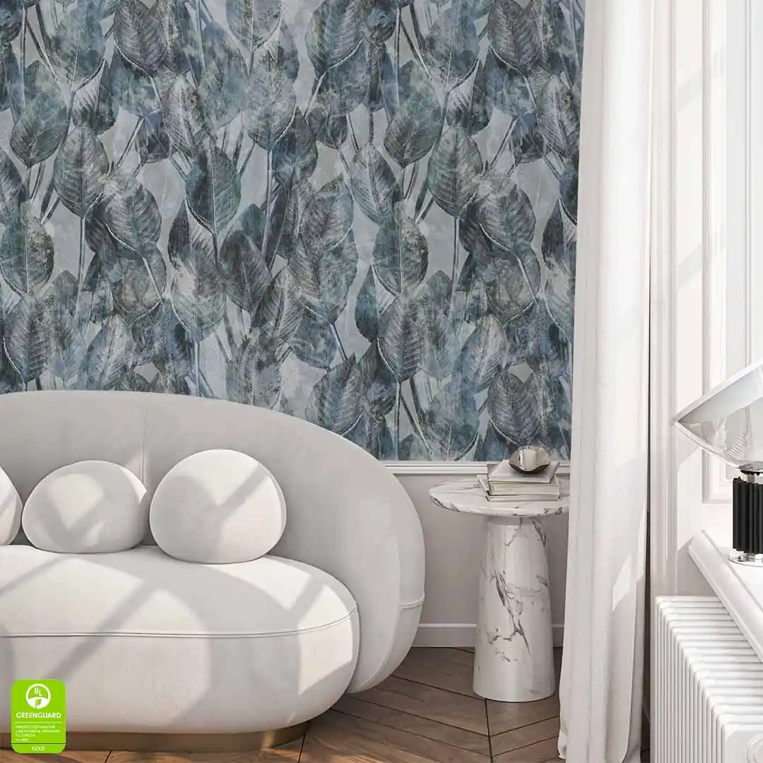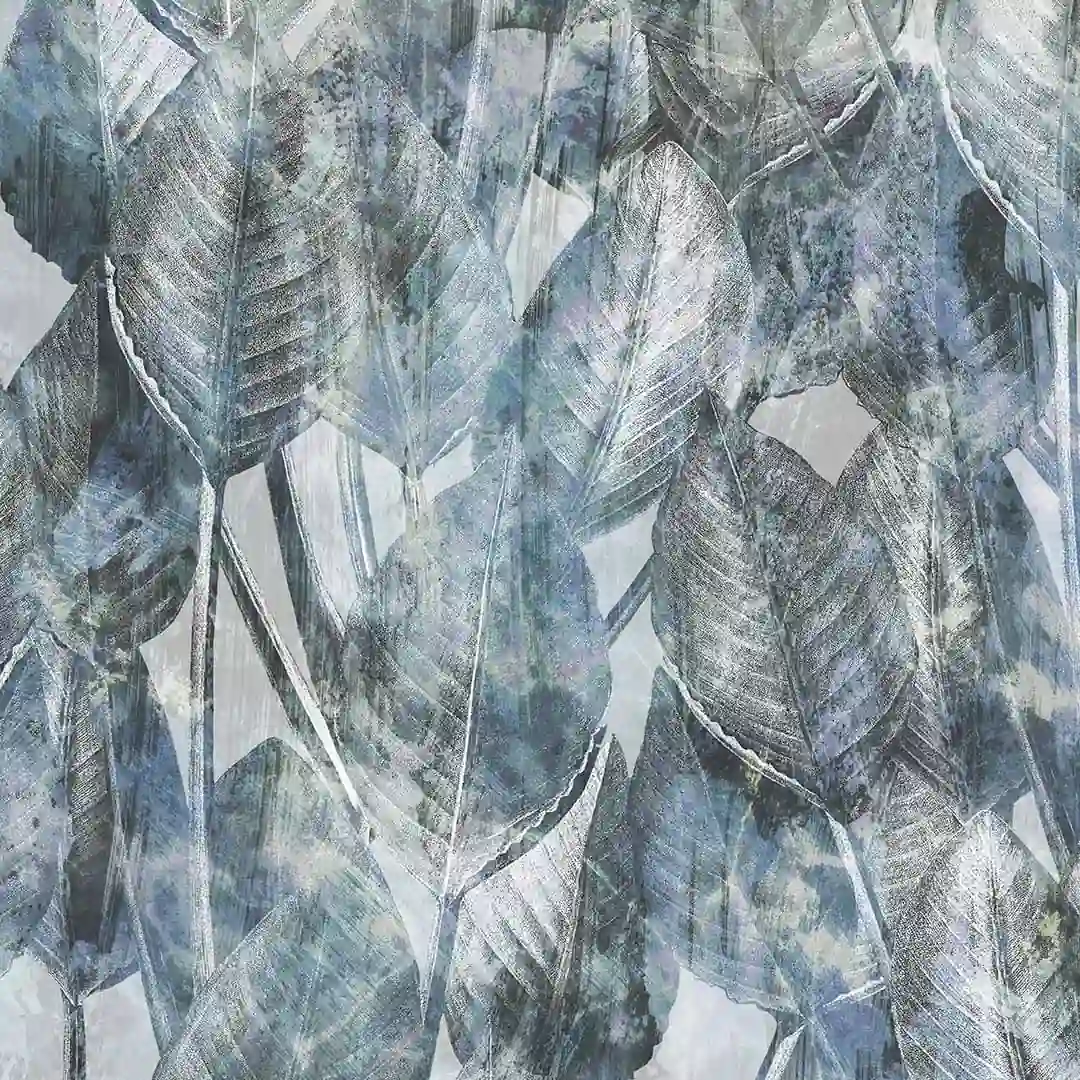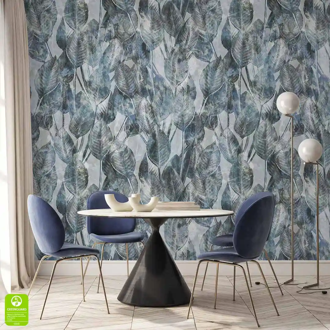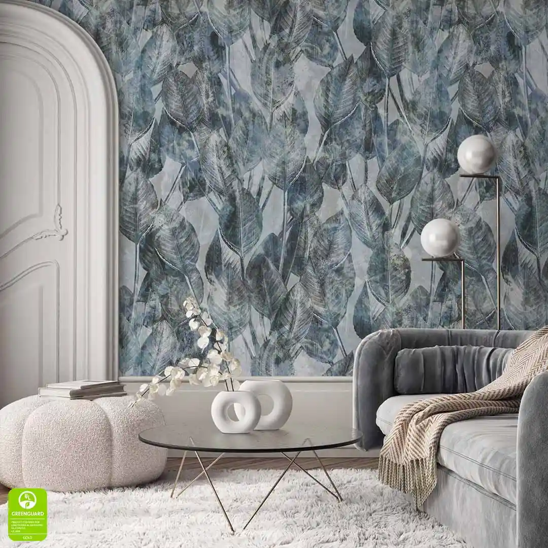 Tapeta ścienna na wymiar w liście w odcieniach granatu i szarości – elegancka tapeta roślinna